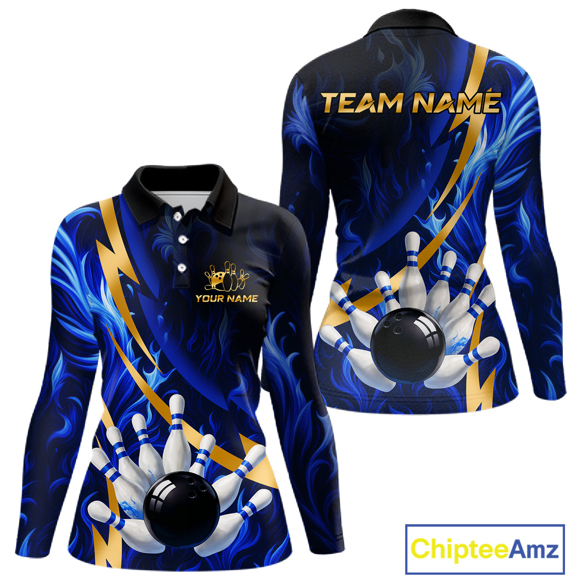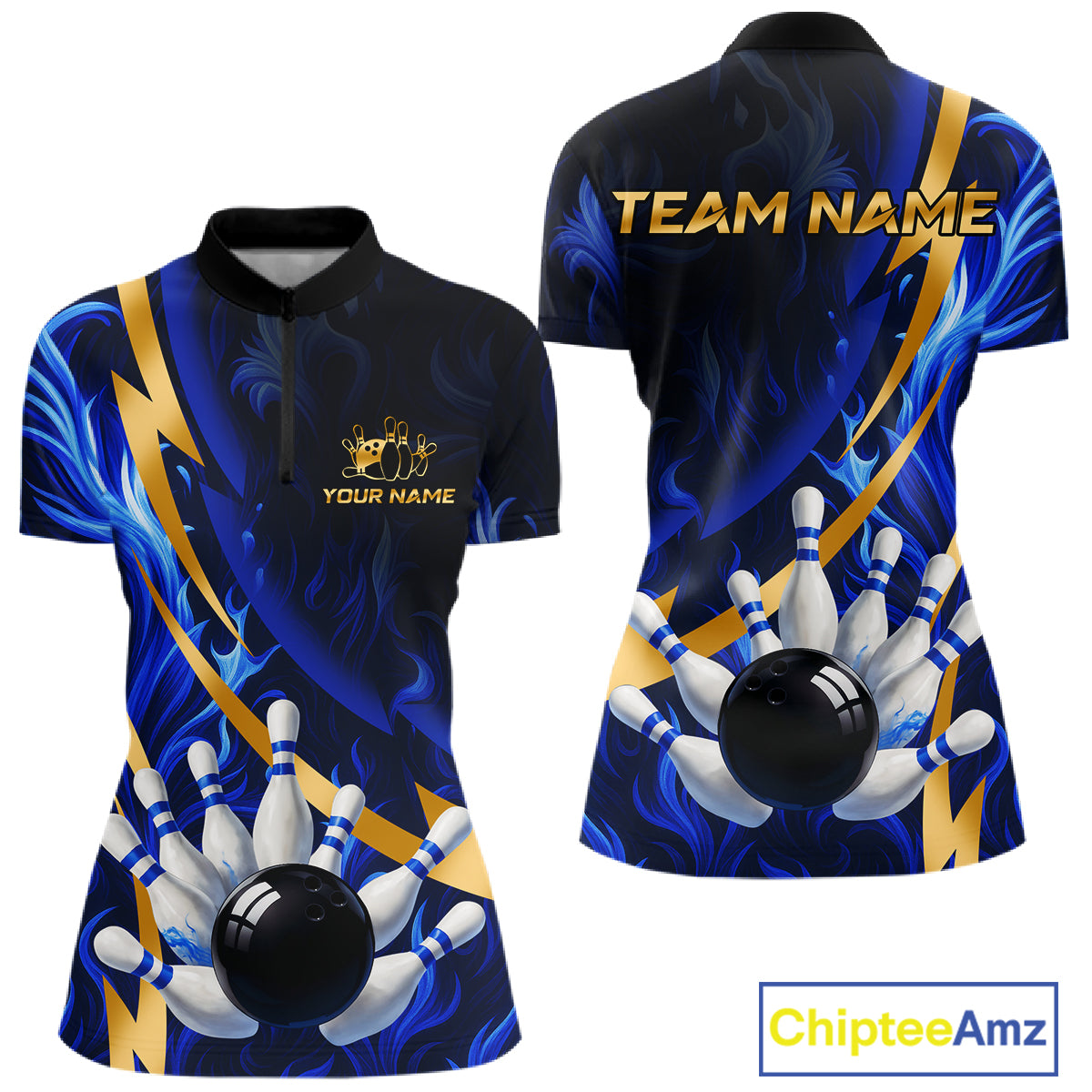 Personalized Bowling Polo, Quarter Zip Shirt for Women Custom Blue Flame and Gold Bowling Team Jersey NQS10446