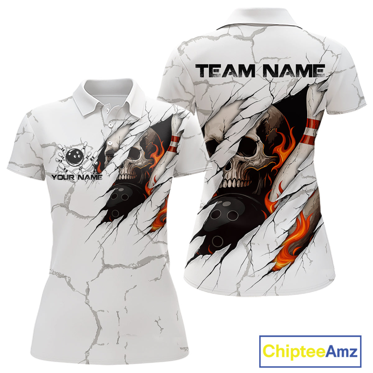 Personalized White Grunge Flame Skull Bowling shirts for Women Custom Team Bowling League Shirts NQS10536