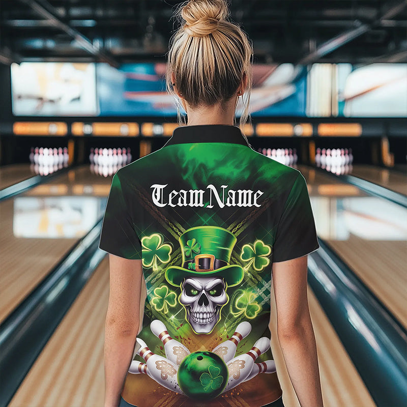 Custom Saint Patricks Day Leprechaun Skull Bowling Polo Shirts, Lucky Bowling Team Shirt IPHW8582