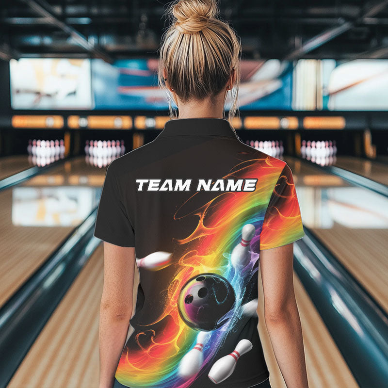 Custom Colorful Rainbow Flame Bowling Team Polo Shirts For Women, Bowling Tournament Outfit IPHW8783
