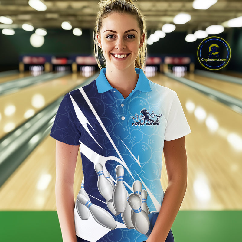 Custom Blue Bowling Pattern Bowling Team Polo Shirts For Women, Blue Bowling Jerseys IPHW9426