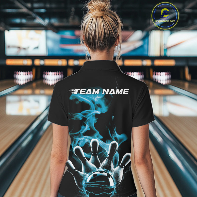 Custom Blue Smoke Bowling Polo Team Shirts For Women, Flame Bowling League Shirt IPHW9565