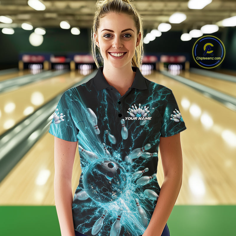 Custom Blue Thunder Lightning Bowling Team Women Polo Shirts, Bowling Jerseys IPHW9742