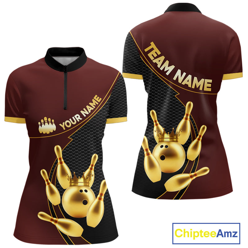 Red and Gold Bowling shirts for Women Custom Team Bowling Polo, 1/4 zip Shirt bowlers Outfit NQS10973