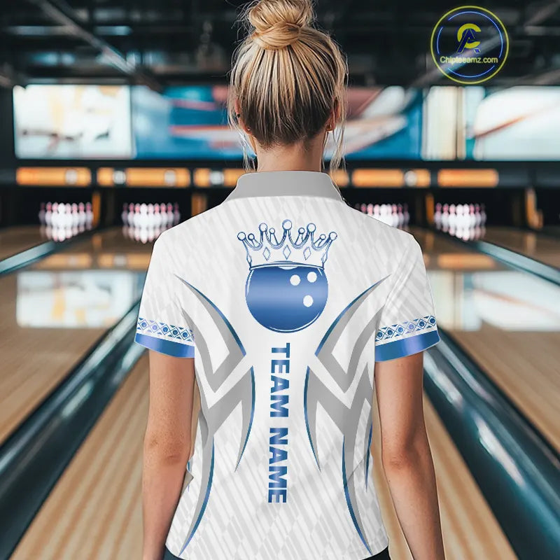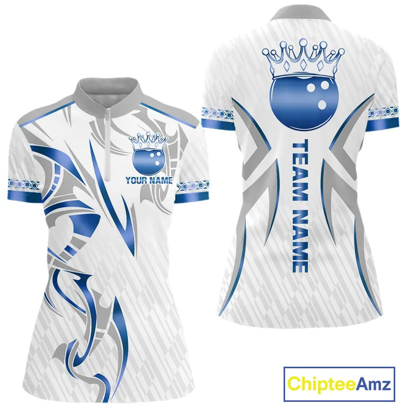 White and Blue crown Bowling ball Polo, Quarter Zip Shirts for Women Custom Bowling Team jerseys NQS11008