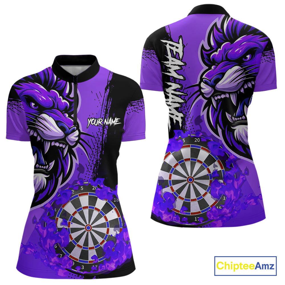 Purple Funny Darts Flame Lion Custom Polo & Quarter-Zip, Personalized Women Dart Shirts Dart Jerseys TDM3973