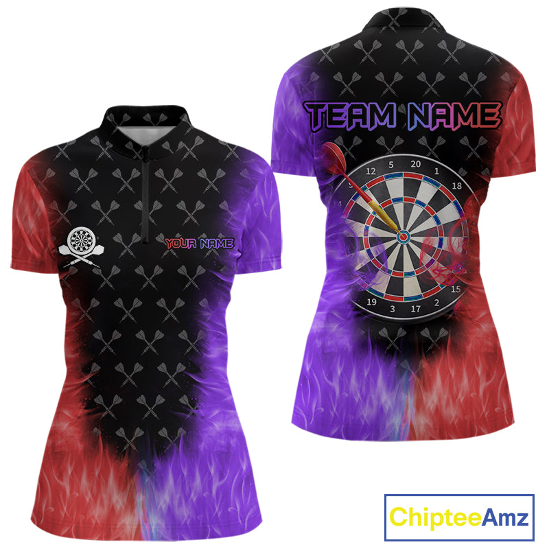 Red And Purple Flame Womens Dart Shirts Custom Dart Jersey Polo & 1/4 Zip, Gifts For Dart Players TDM5146