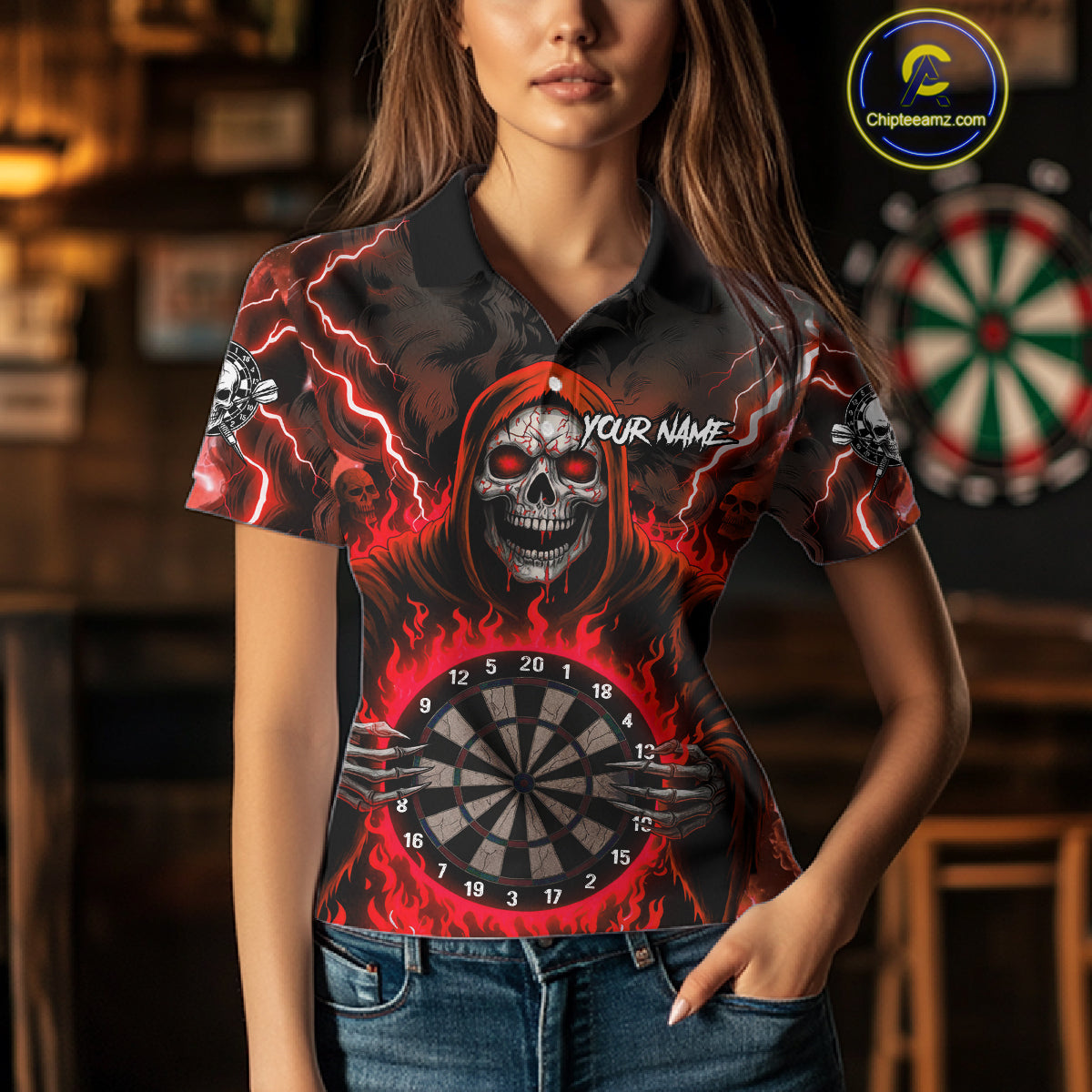 Red Grim Reaper Thunder Lightning Womens Dart Shirts Custom Flame Dart Jerseys Team Polo & 1/4 Zip TDM5175