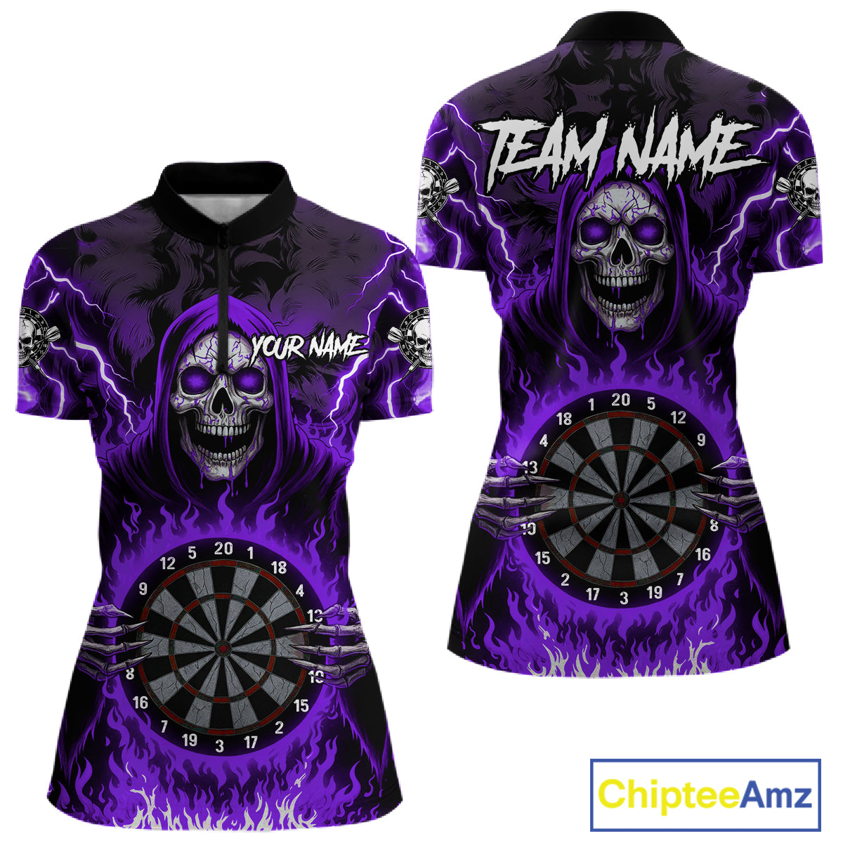 Purple Grim Reaper Thunder Lightning Women Dart Shirts Custom Flame Dart Jerseys Team Polo & 1/4 Zip TDM5176