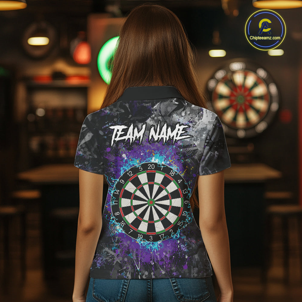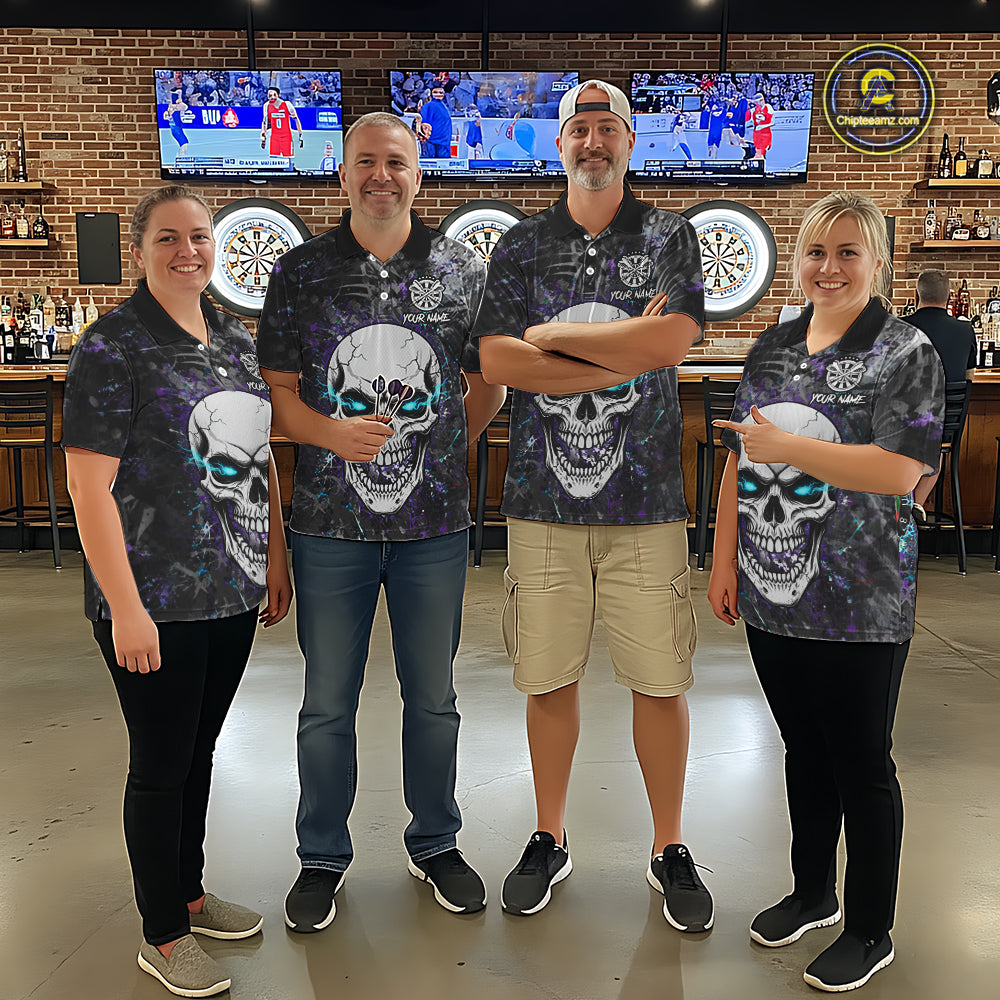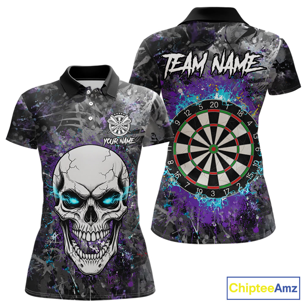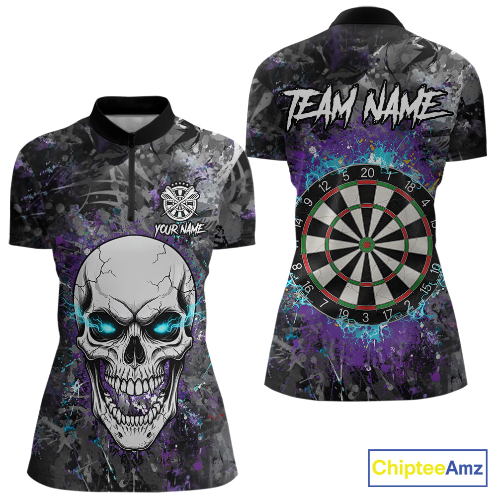 Blue Purple Grunge Skull Darts Polo & 1/4 Zip For Women Custom Darts Team Jersey, Funny Darts Gifts TDM5504