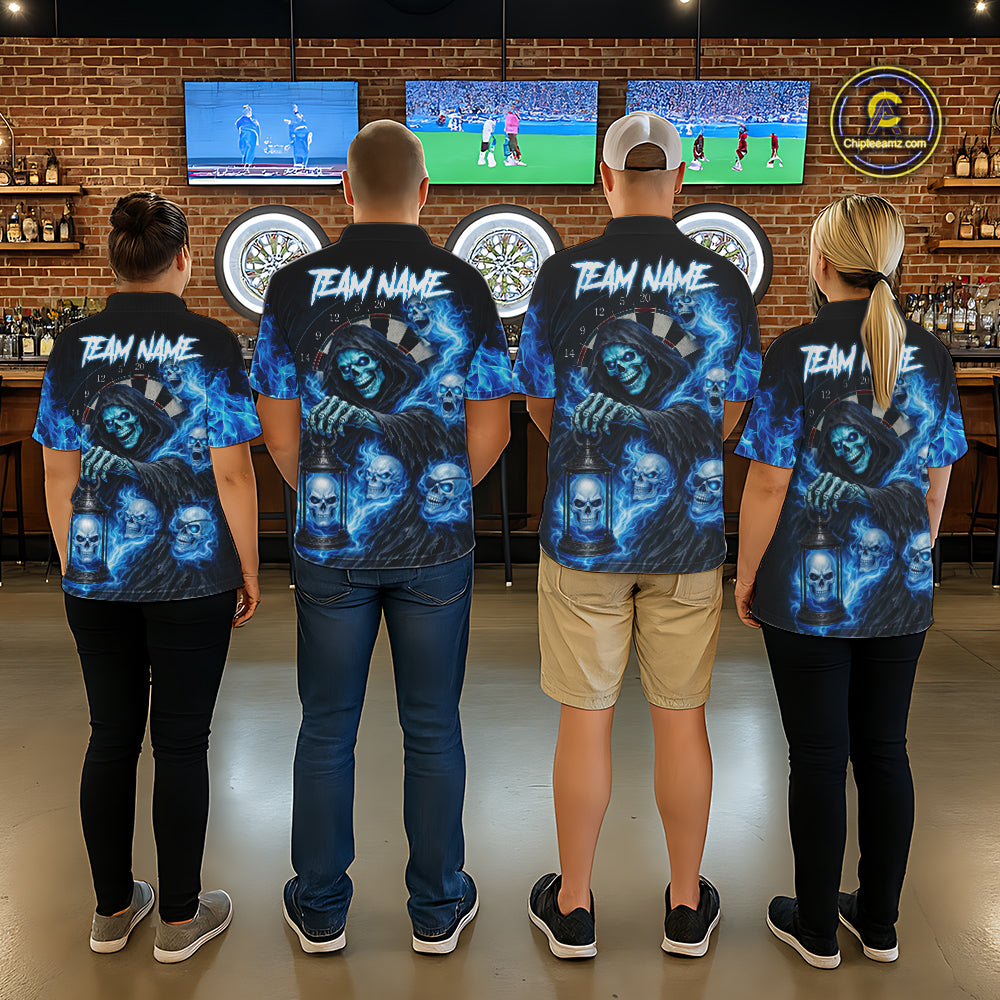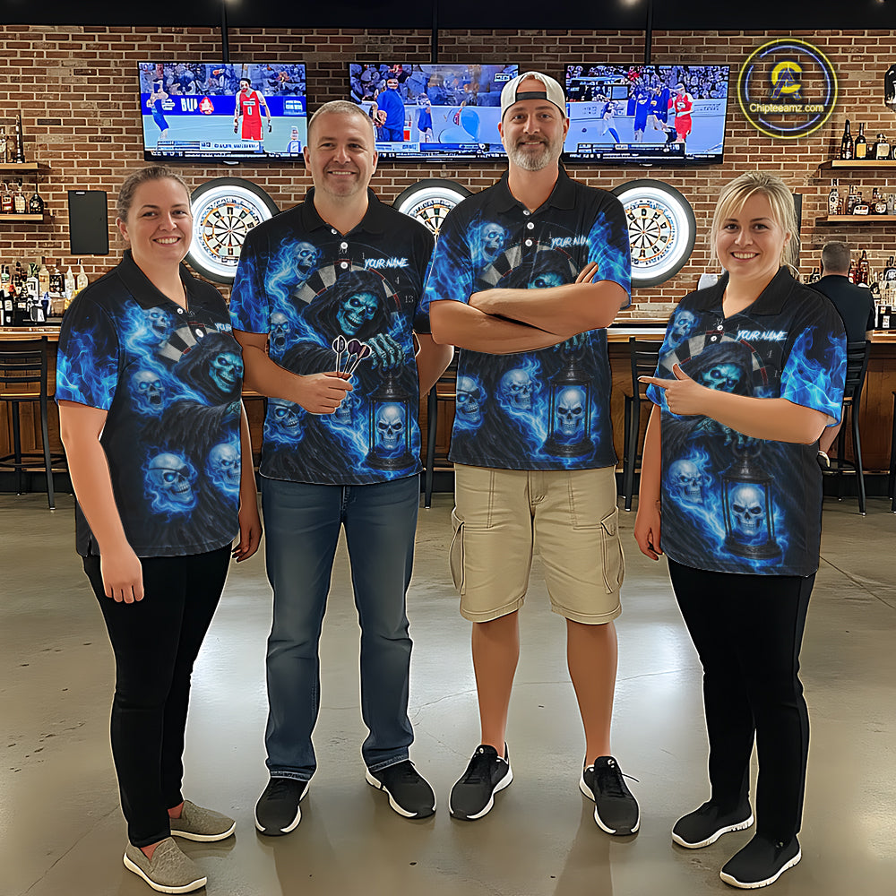 Blue Grim Reaper Flame Darts Shirt For Women Custom Skull Darts League Jersey Team Polo & Quarter Zip TDM5560
