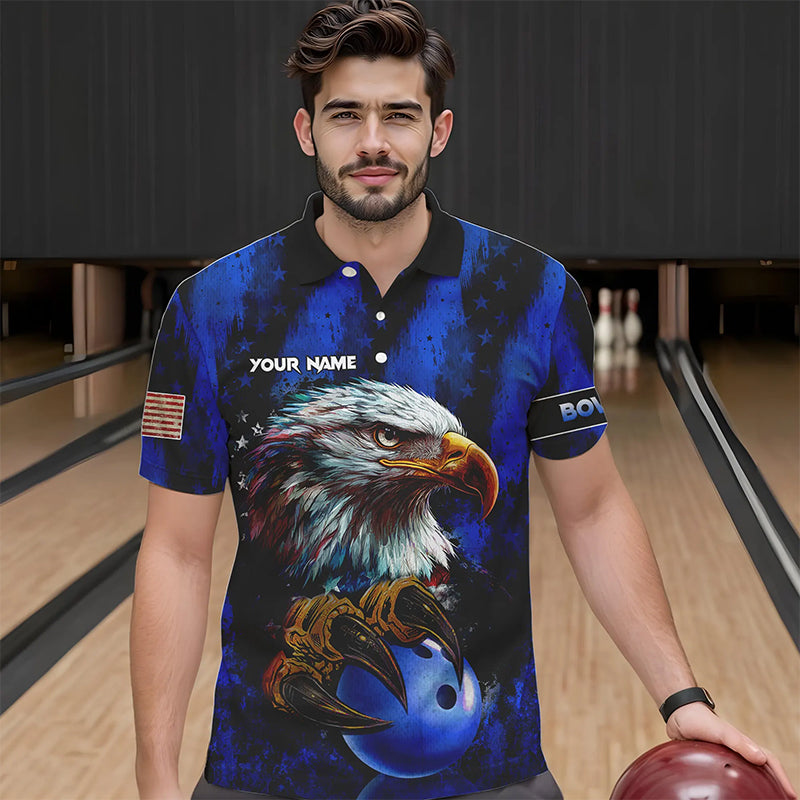 American Flag Eagle Mens Bowling Polo, 1/4 Zip Shirt Custom Name Patriotic Bowling Team Jersey | Blue NQS9755