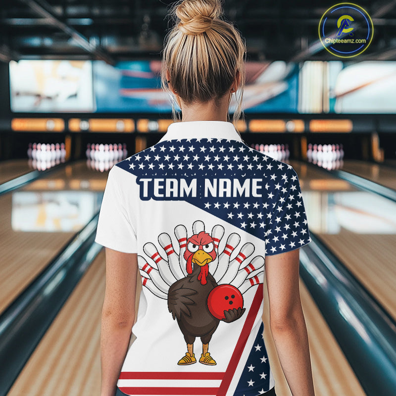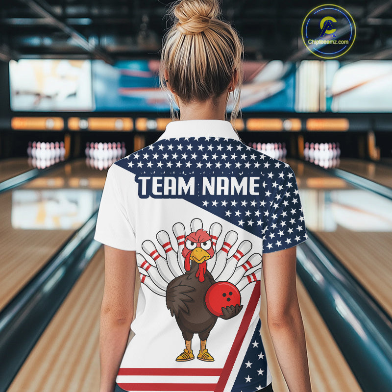 American Flag Funny Turkey Bowling Polo, 1/4 Zip shirt for Women custom patriotic bowling team jersey NQS10272
