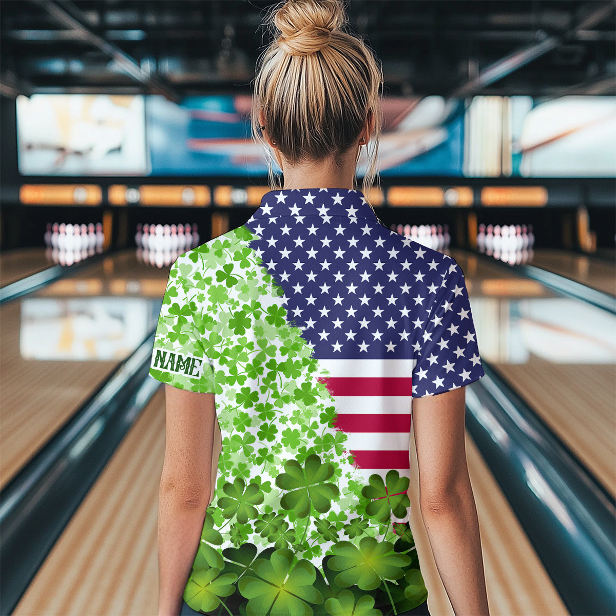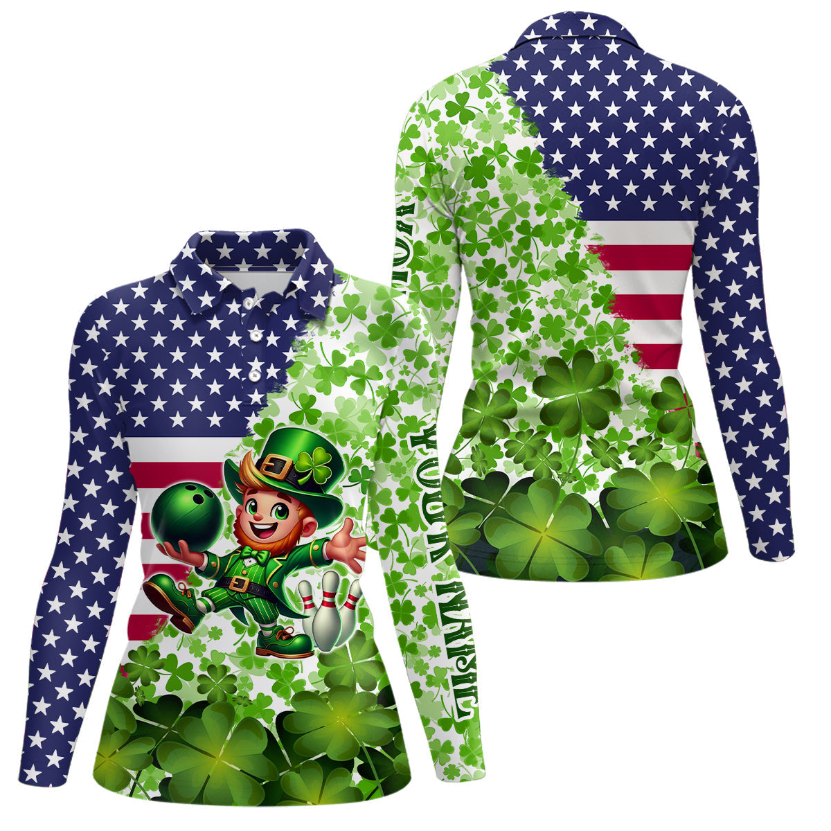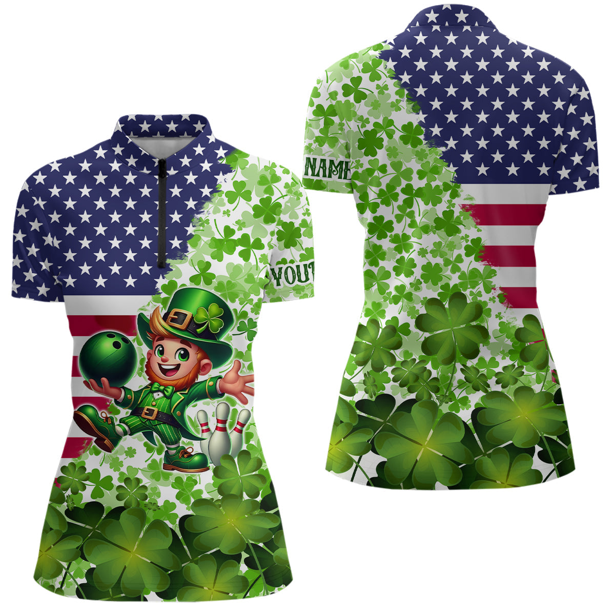 American flag St Patrick day shamrock pattern custom Team Bowling Polo, Quarter Zip shirt for Women NQS9581