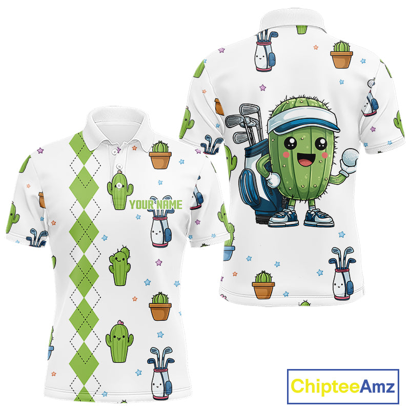 Argyle Pattern Mens Golf Polo Shirts Funny Cactus Flower Custom Cactus Golf Shirt Golfer Gifts NHN0012