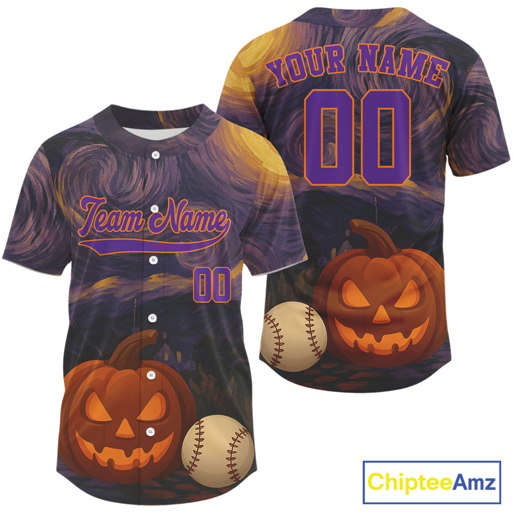 Custom Pumpkin Funny Halloween Baseball Jersey For Men Purple Halloween Baseball Shirt NYN0827