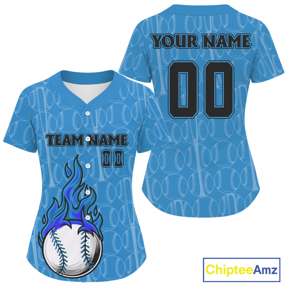 Custom Blue Flames Baseball Ball Jersey For Women Personalized Youth Baseball Shirt NYN0900