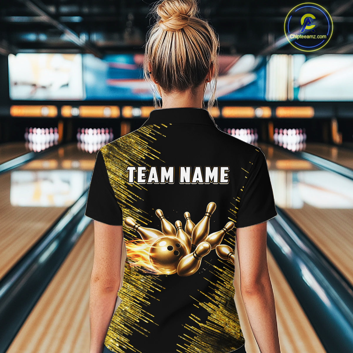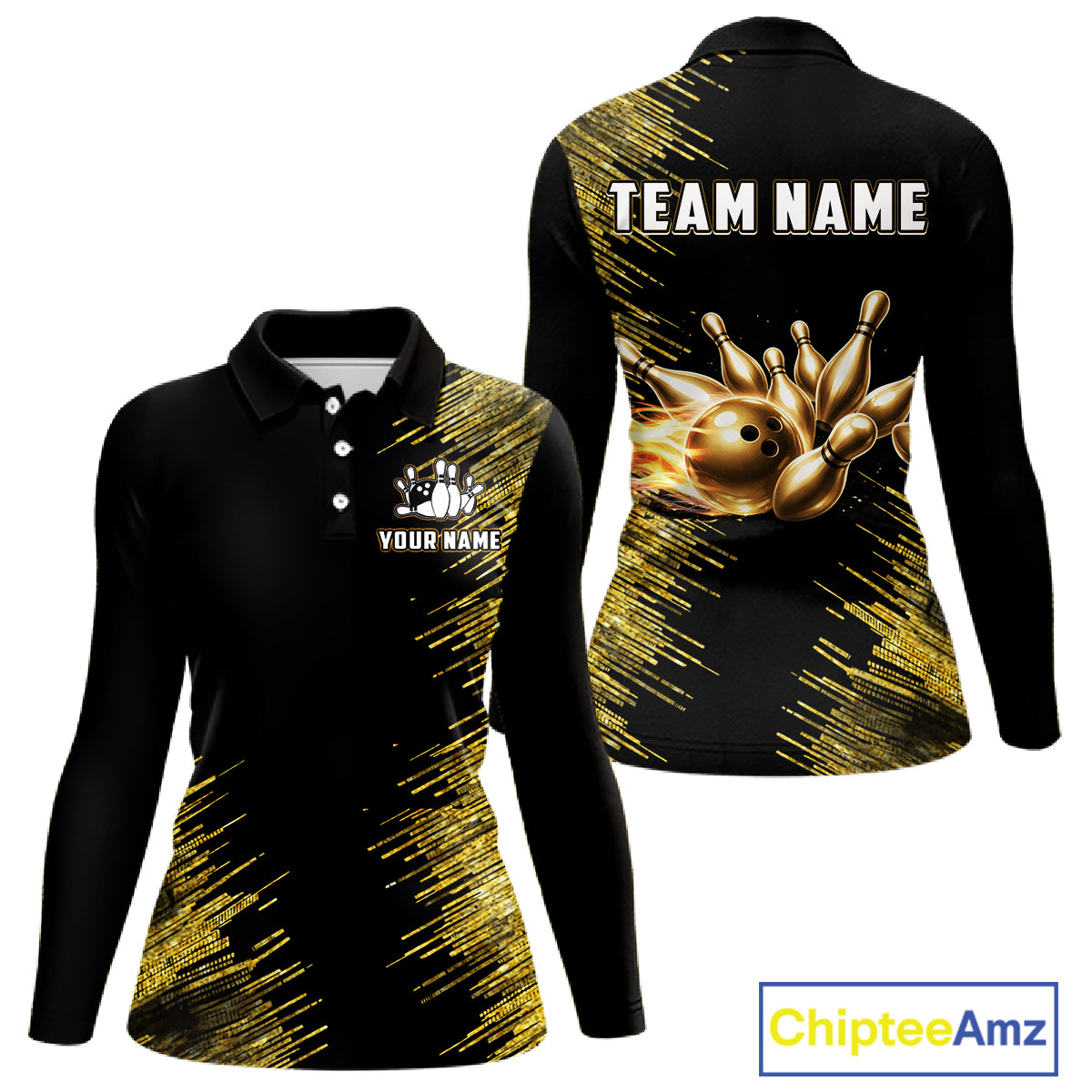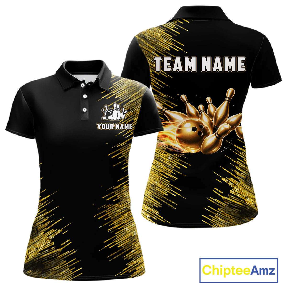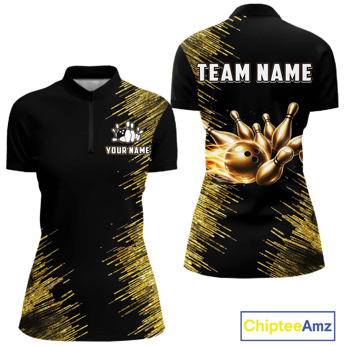 Black and Gold Flame Bowling Shirts For Women Custom Team Bowling jerseys, Gift For Bowlers NQS11342