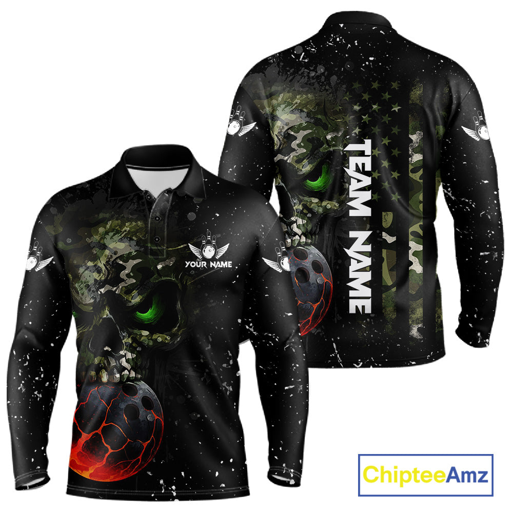 Black and Green Camo grunge American Flag Skull Bowling Shirts for Men Custom Bowling Team jerseys NQS11294