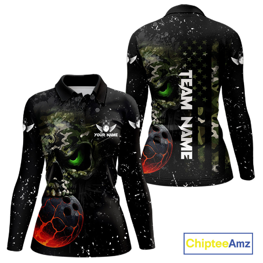 Black and Green Camo grunge American Flag Skull Bowling Shirts for Women Custom Bowling Team jerseys NQS11294