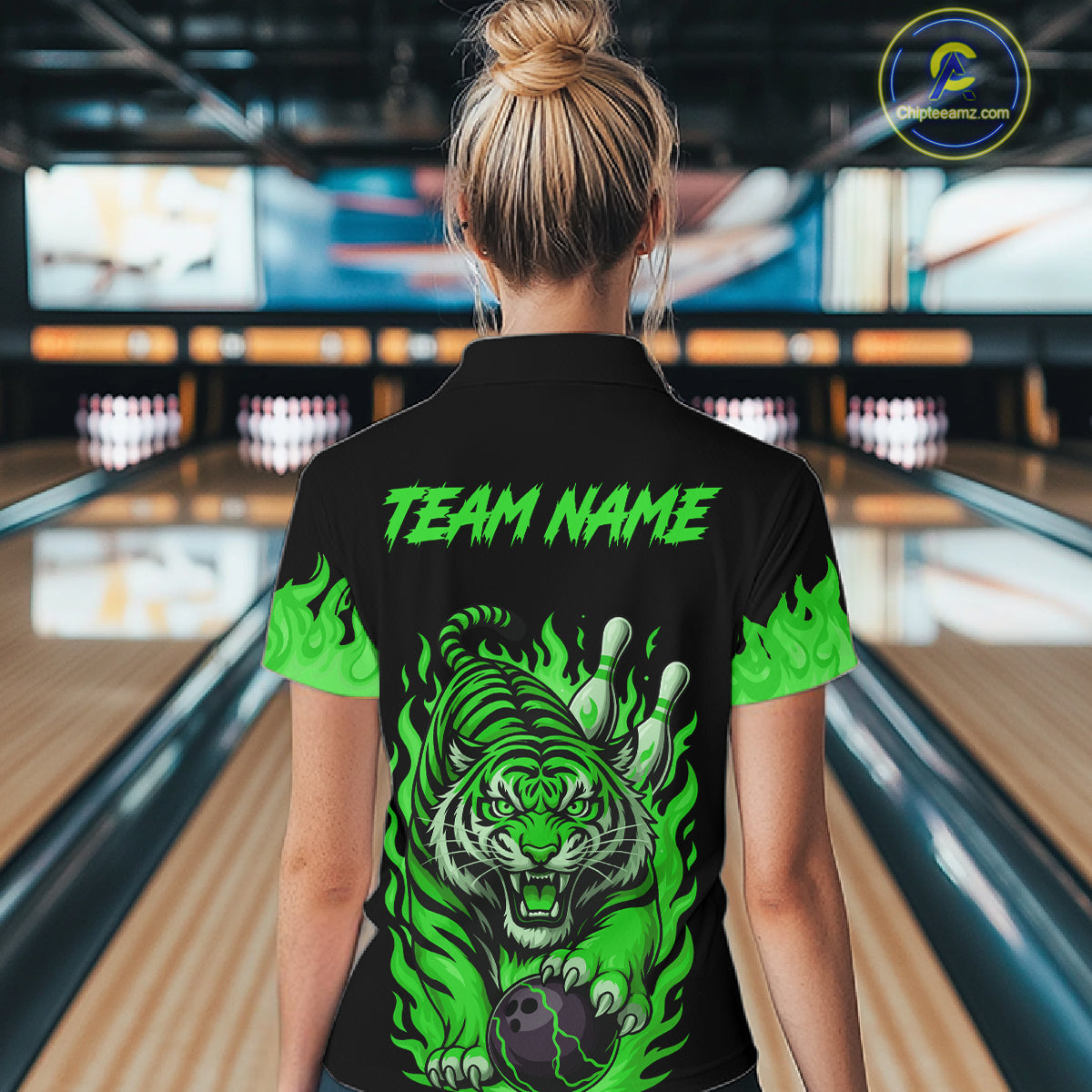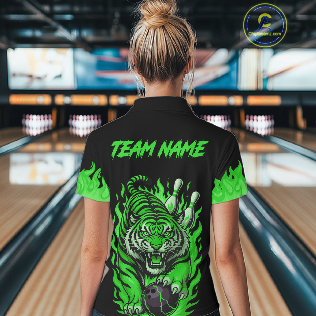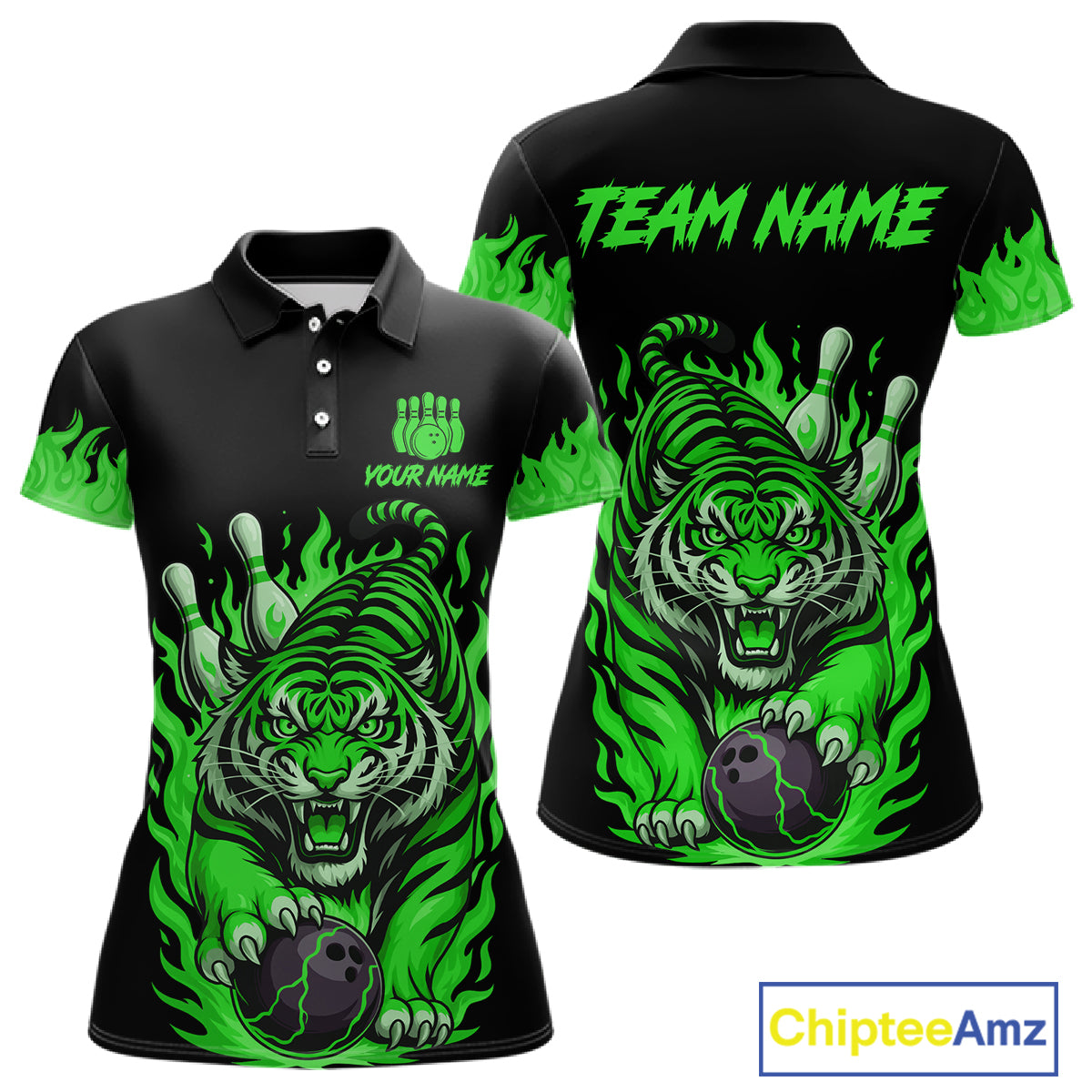 Black and Green Flame Tiger Bowling Polo, 1/4 Zip Shirts for Women Custom Team Tiger Bowling Jersey NQS11257