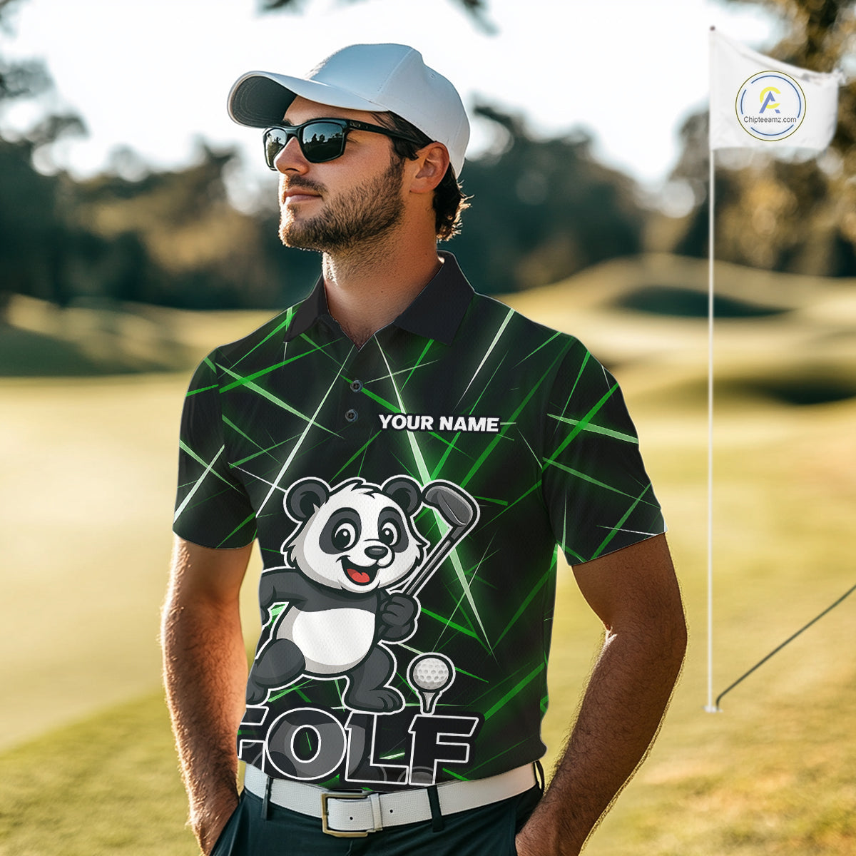 Black and Green Funny Panda Playing Golf Polo Shirt For Men Custom men's golf clothes funny golf gift NQS10740