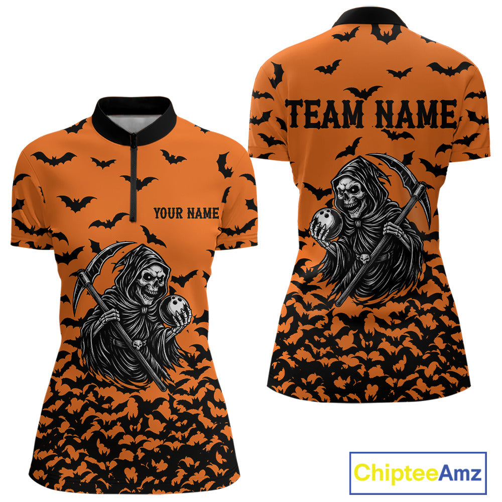 Black and Orange Bats Halloween Skull Reaper Bowling Shirts For Women Custom Bowling Team Jerseys NQS10755