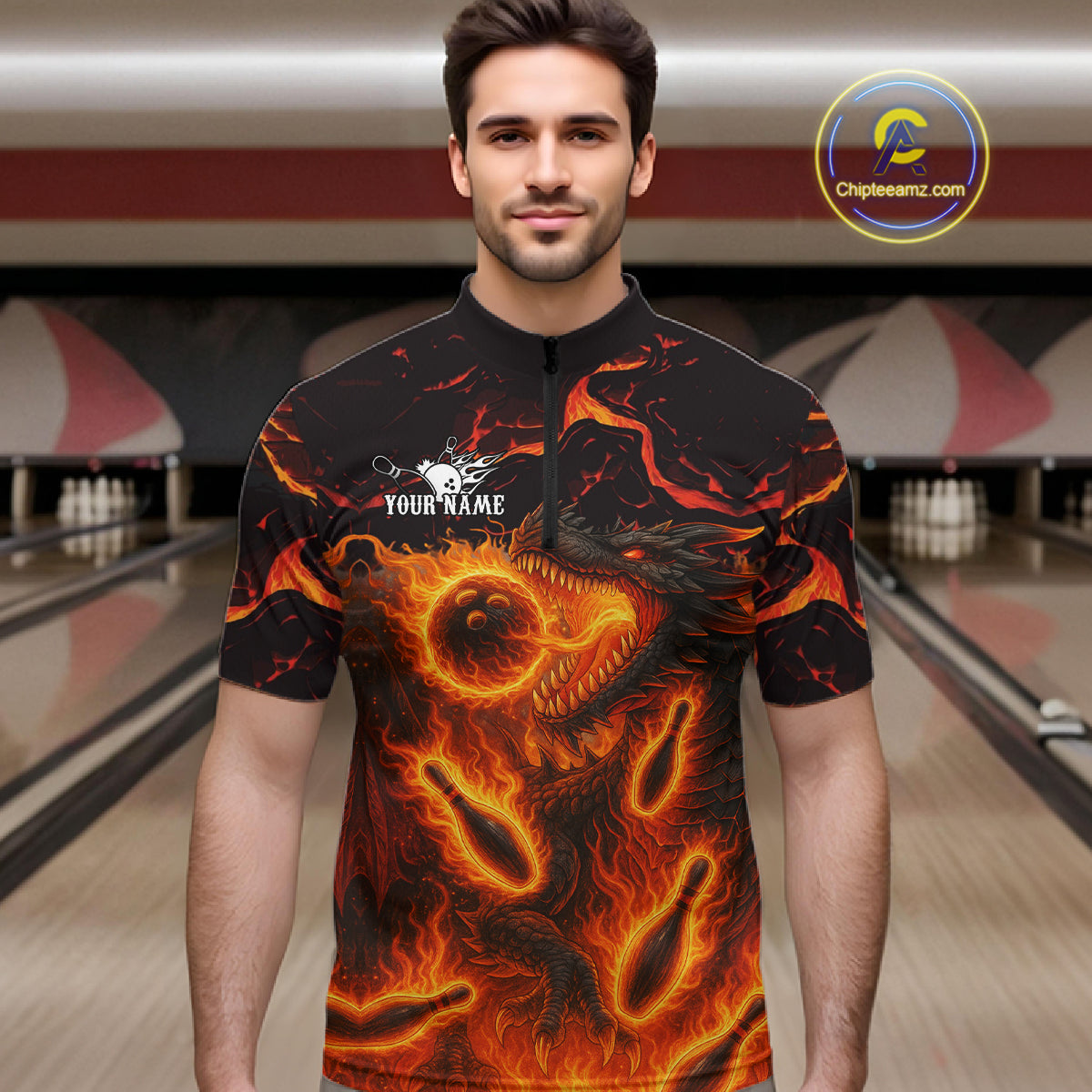 Black And Orange Flame Custom Dragon Bowling Shirts For Men, Dragon Team Bowling League Shirts NQS11071