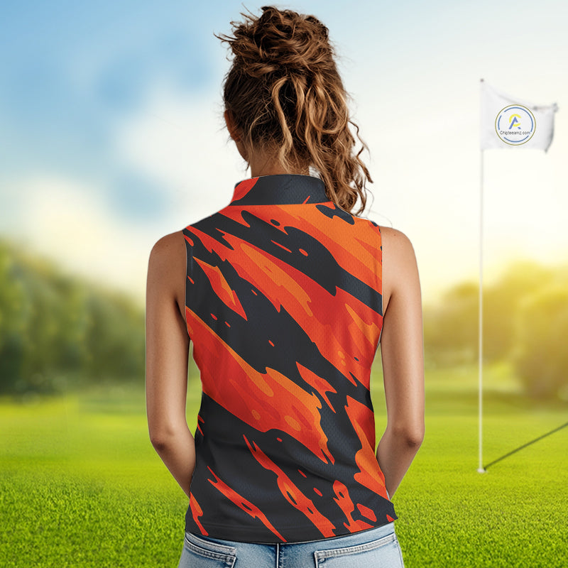 Black and Orange Flame Women Sleeveless Golf polo shirts Custom ladies golf outfit, golf gifts NQS10069