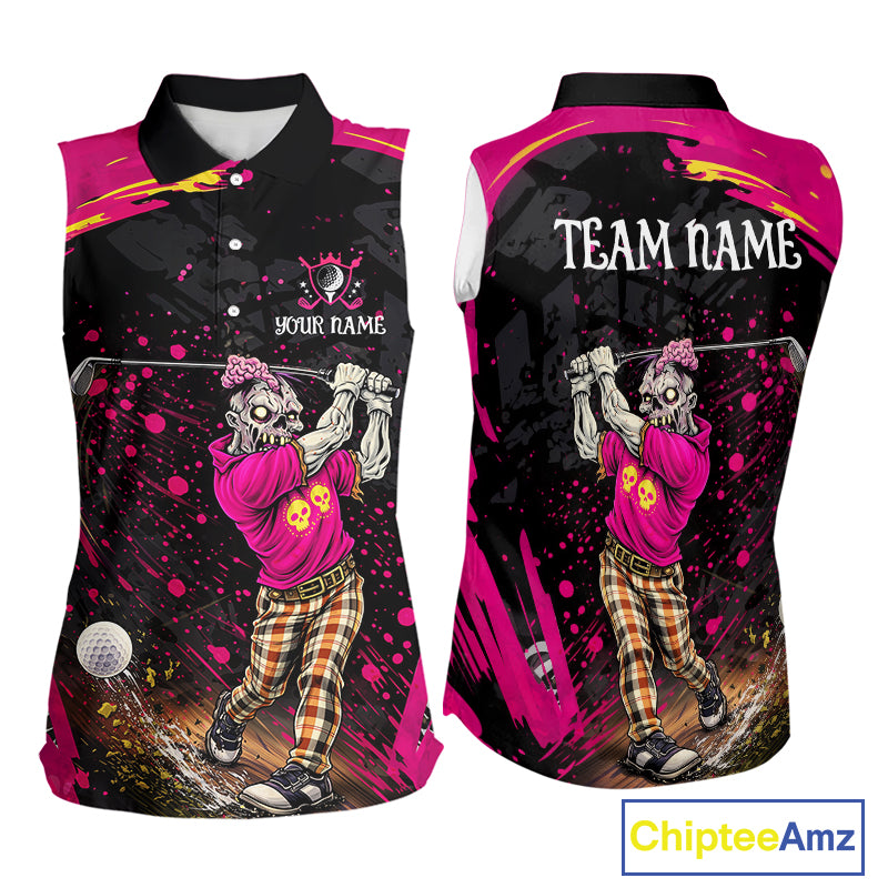 Black and Pink Funny zombie women's sleeveless polo shirts  Custom sleeveless golf shirts for women NQS11443