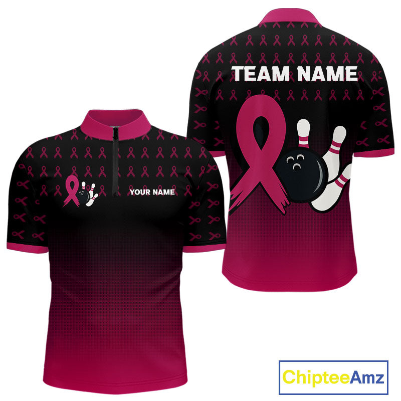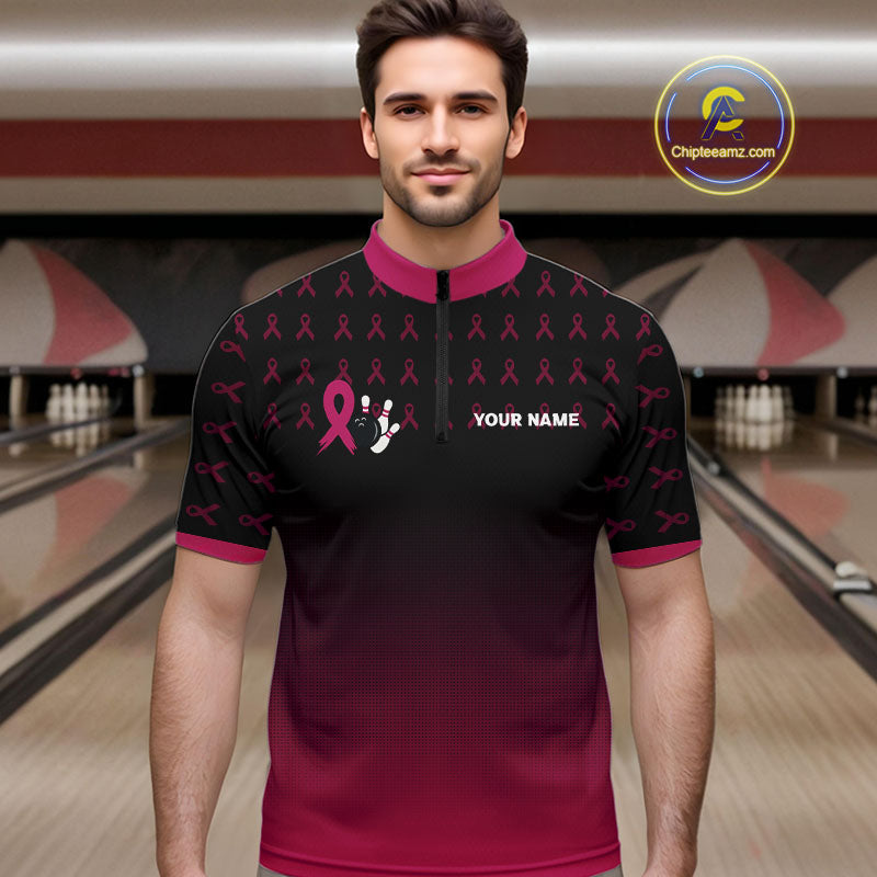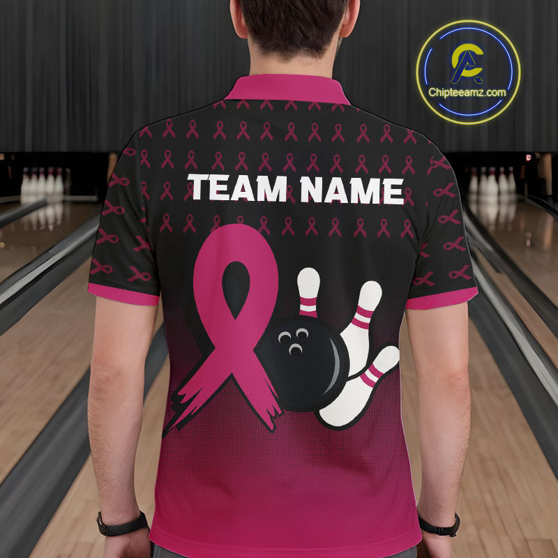 Black and Pink ribbon pattern Bowling shirts for Men Custom breast cancer bowling team jerseys NQS10158