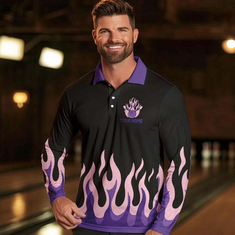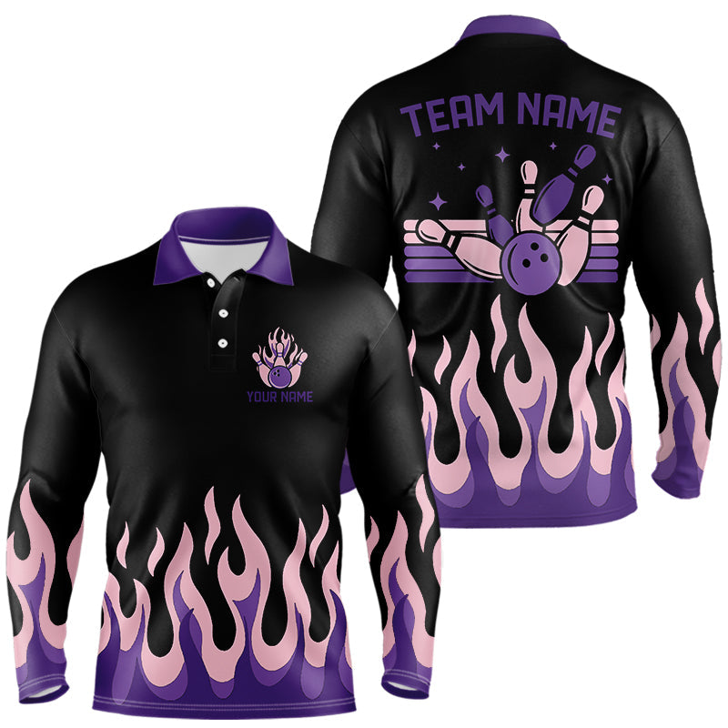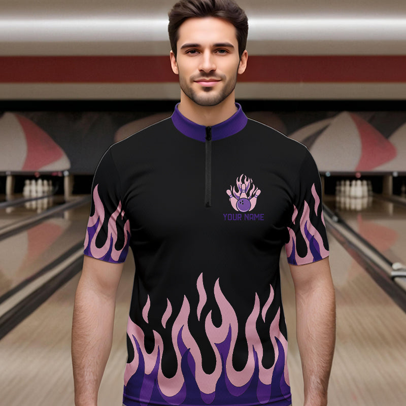 Black and Purple Flame Retro Bowling Polo, Quarter Zip Shirt for Men Custom Bowling Team Jerseys NQS9427