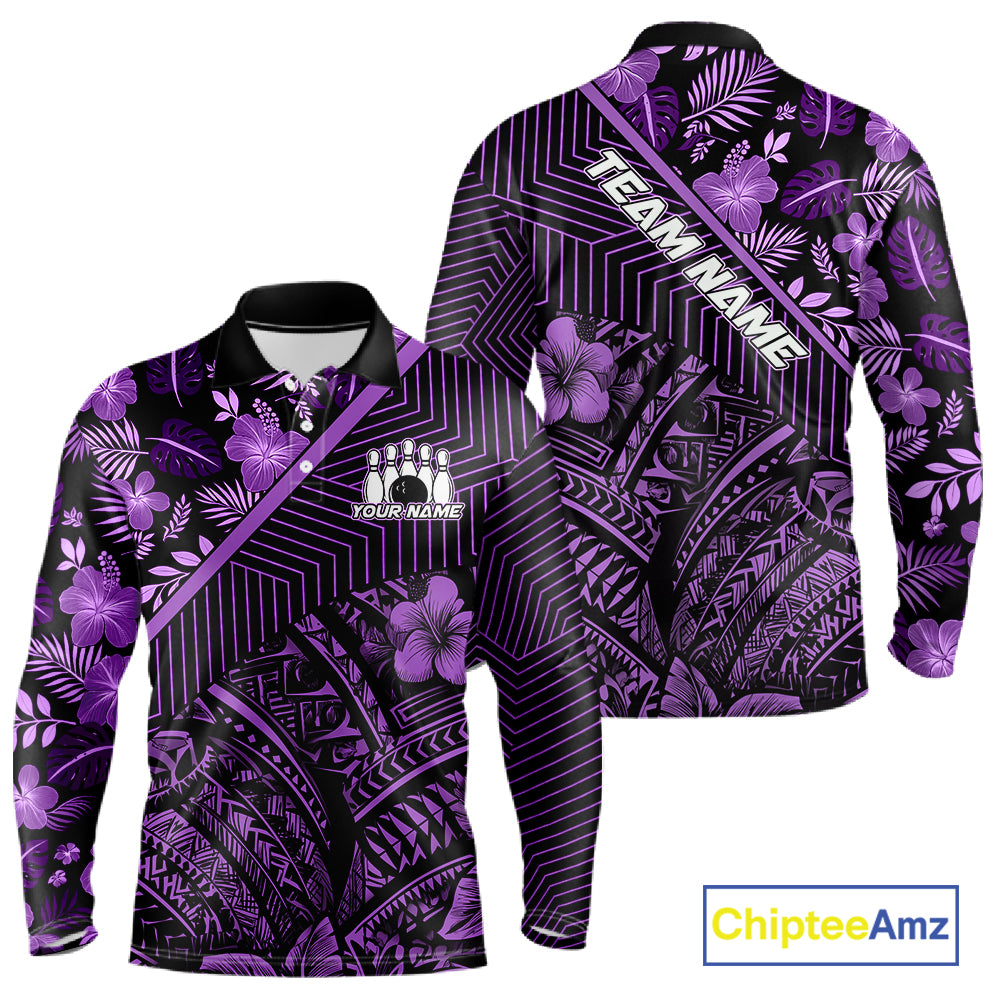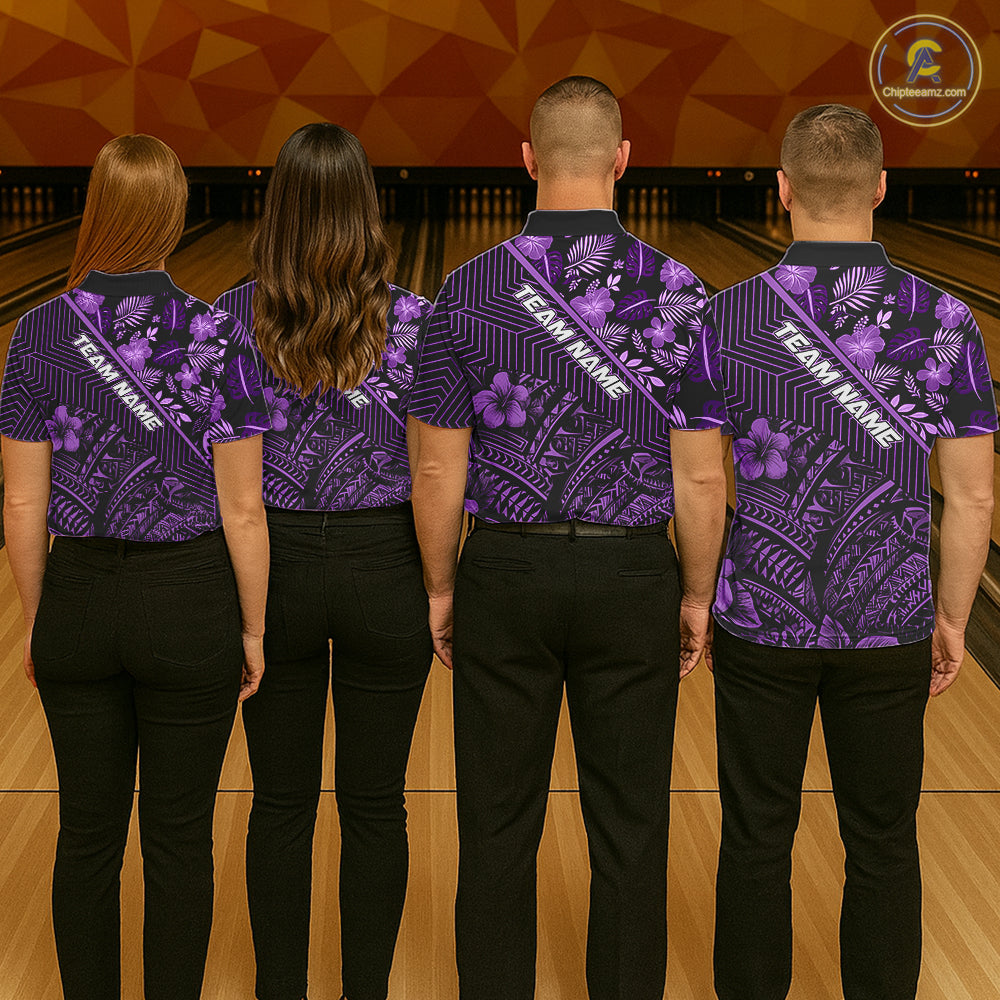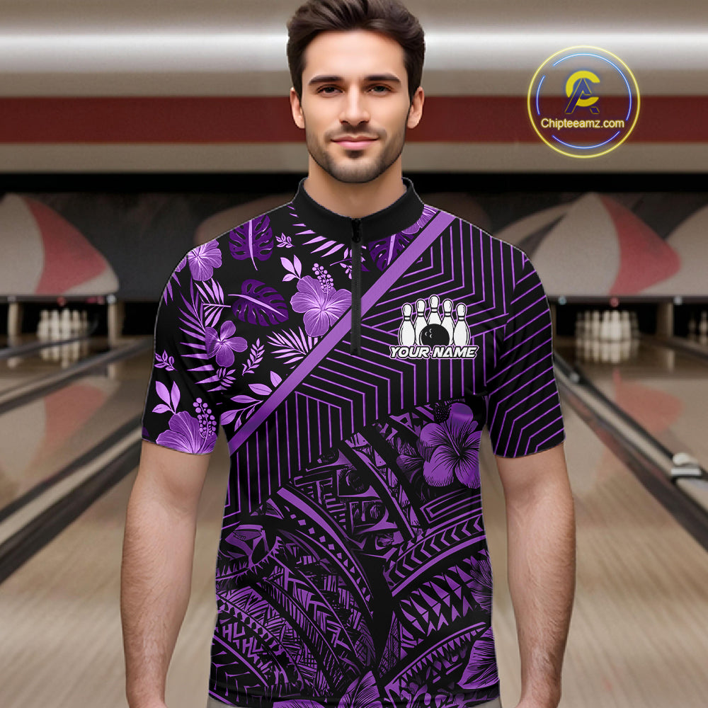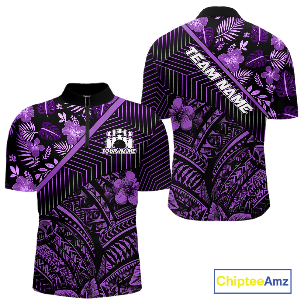 Black and Purple tribal pattern Bowling Polo, 1/4 zip Shirts For Men Custom Team Bowling Jerseys NQS11470