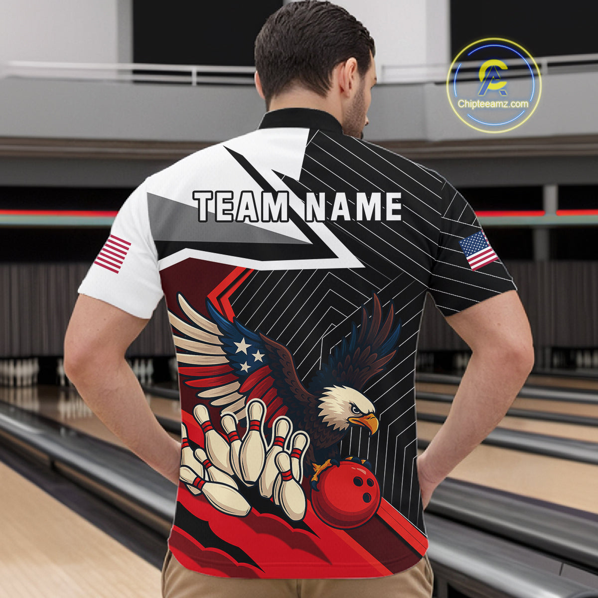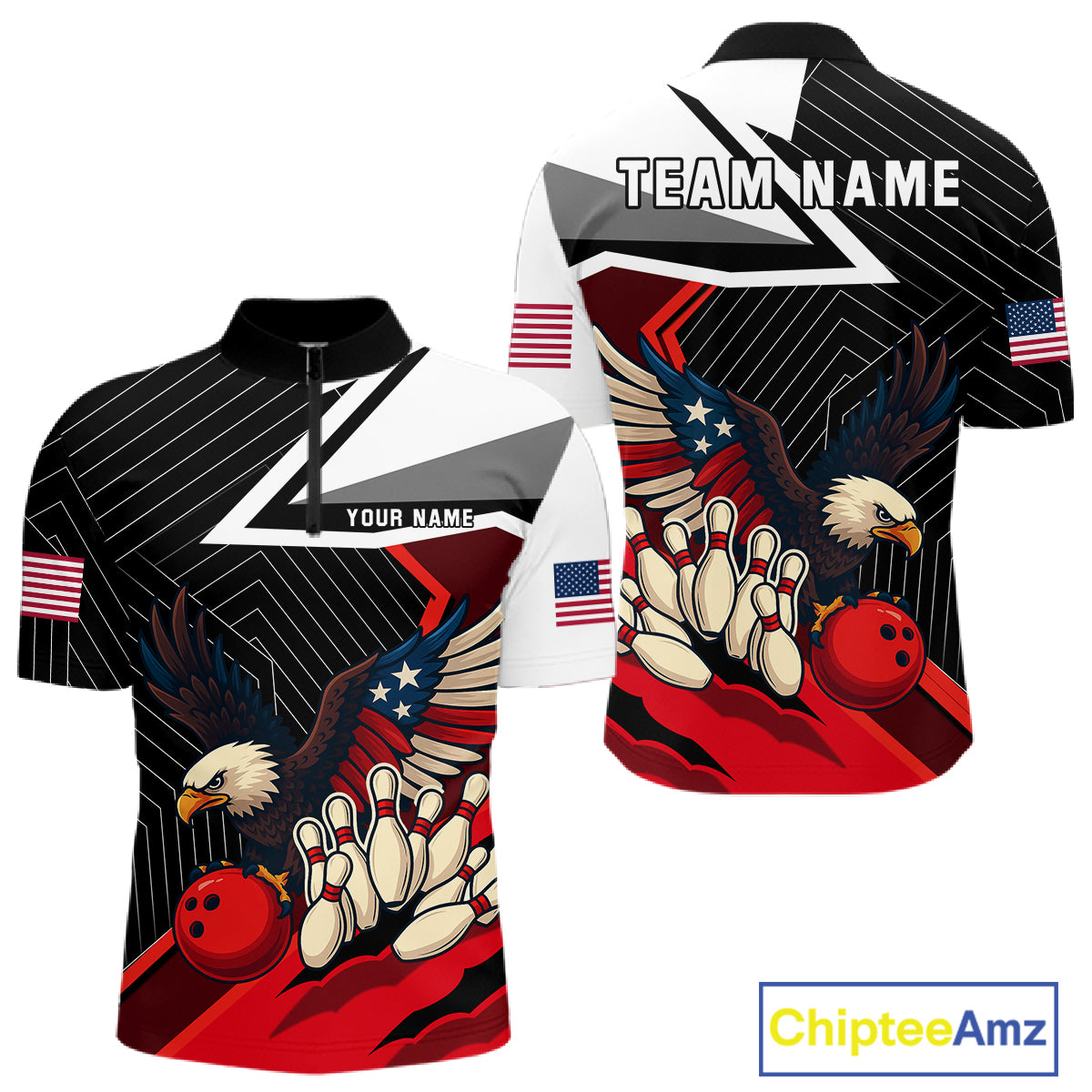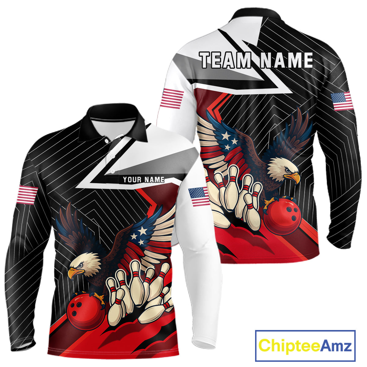 Black and Red American Flag Eagle Bowling Shirts for Men Custom patriotic Team Bowling League Jersey NQS10517
