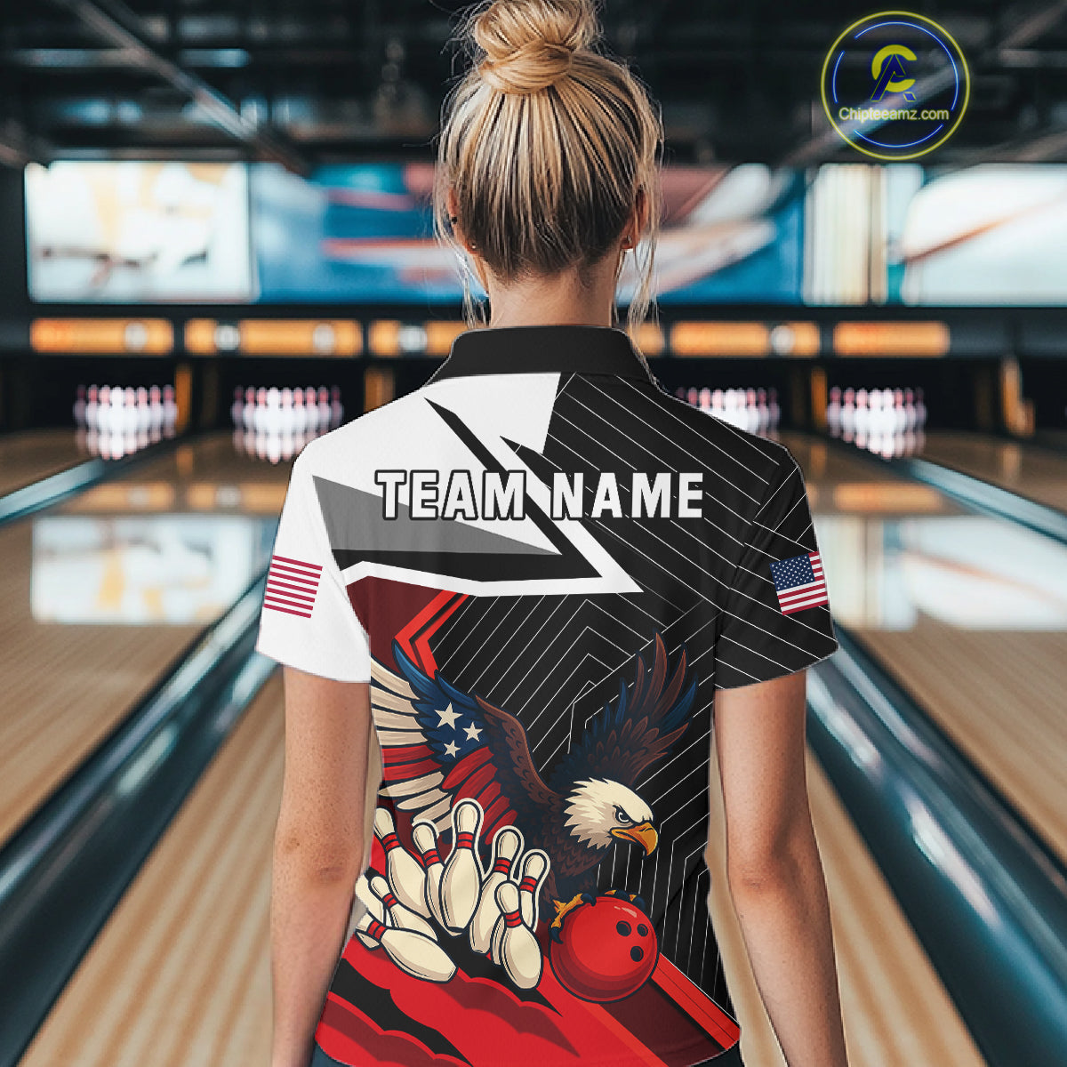 Black and Red American Flag Eagle Bowling Shirts for Women Custom patriotic Team Bowling Jersey NQS10517