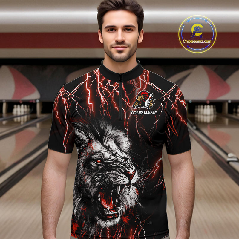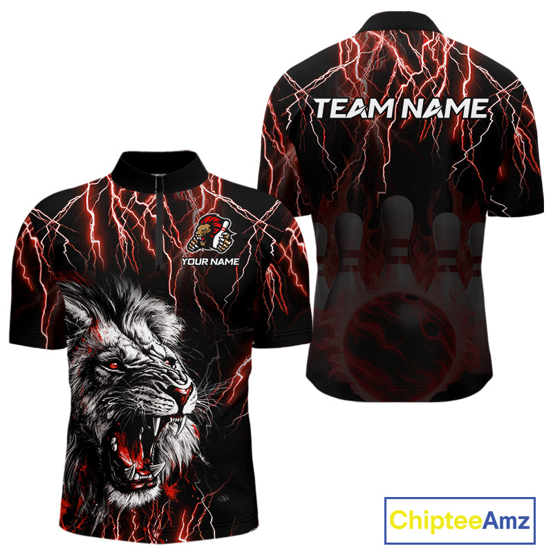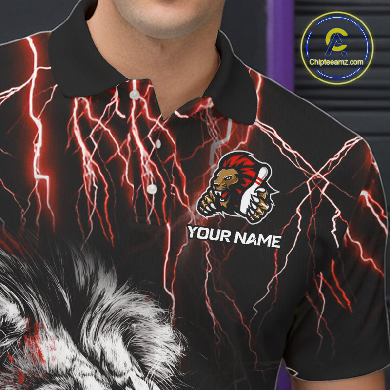 Black and Red Lightning Thunder Lion Bowling Shirt For Men Custom Lion Bowling Team Jerseys NQS11046