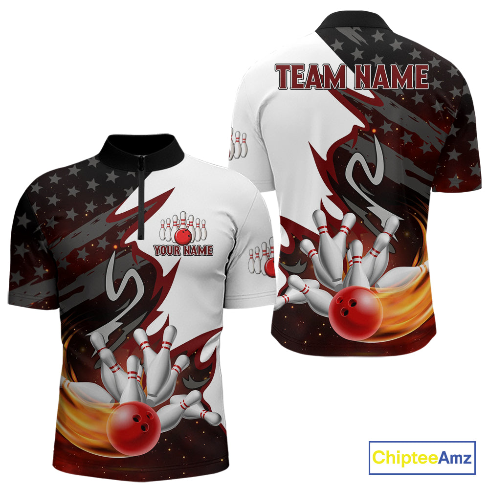 Black and White American flag Bowling jersey Custom Patriotic Bowling Polo, 1/4 Zip Shirts For Men NQS10999