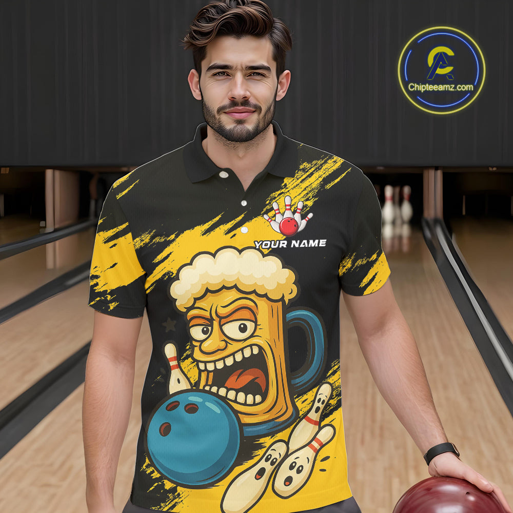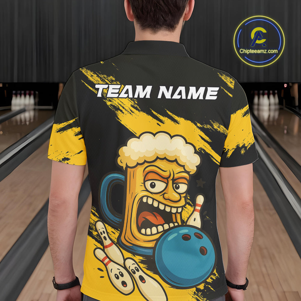 Black And Yellow Funny Beer Bowling Men Polo, 1/4 Zip Shirts Custom Angry Beer Glass Bowling Jersey NQS10784