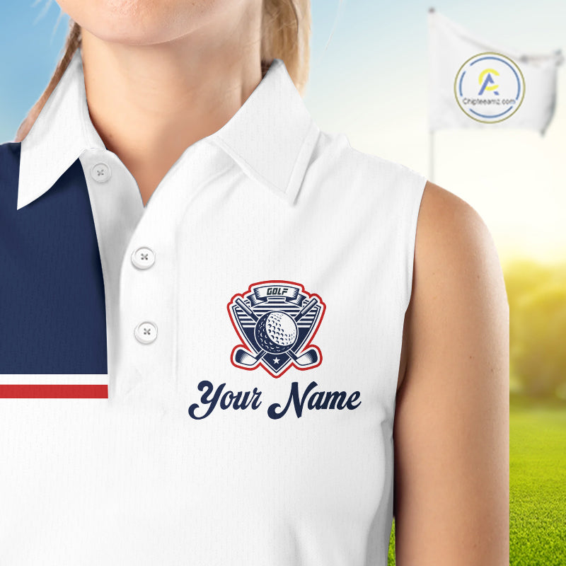 Blue And White Golf Polo Shirt, Custom Name Womens Sleeveless Golf Polo Shirt, Personalized Golf Gifts NHN0117