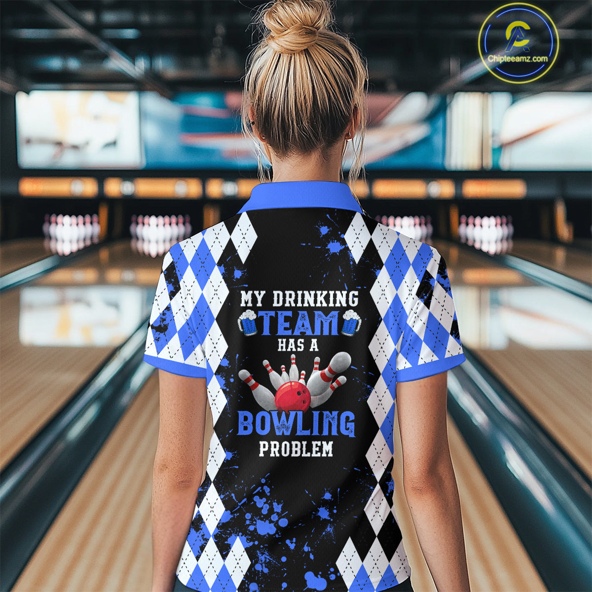 Blue argyle pattern Retro Bowling Shirts For Women Custom My drinking team has a bowling problem NQS9824