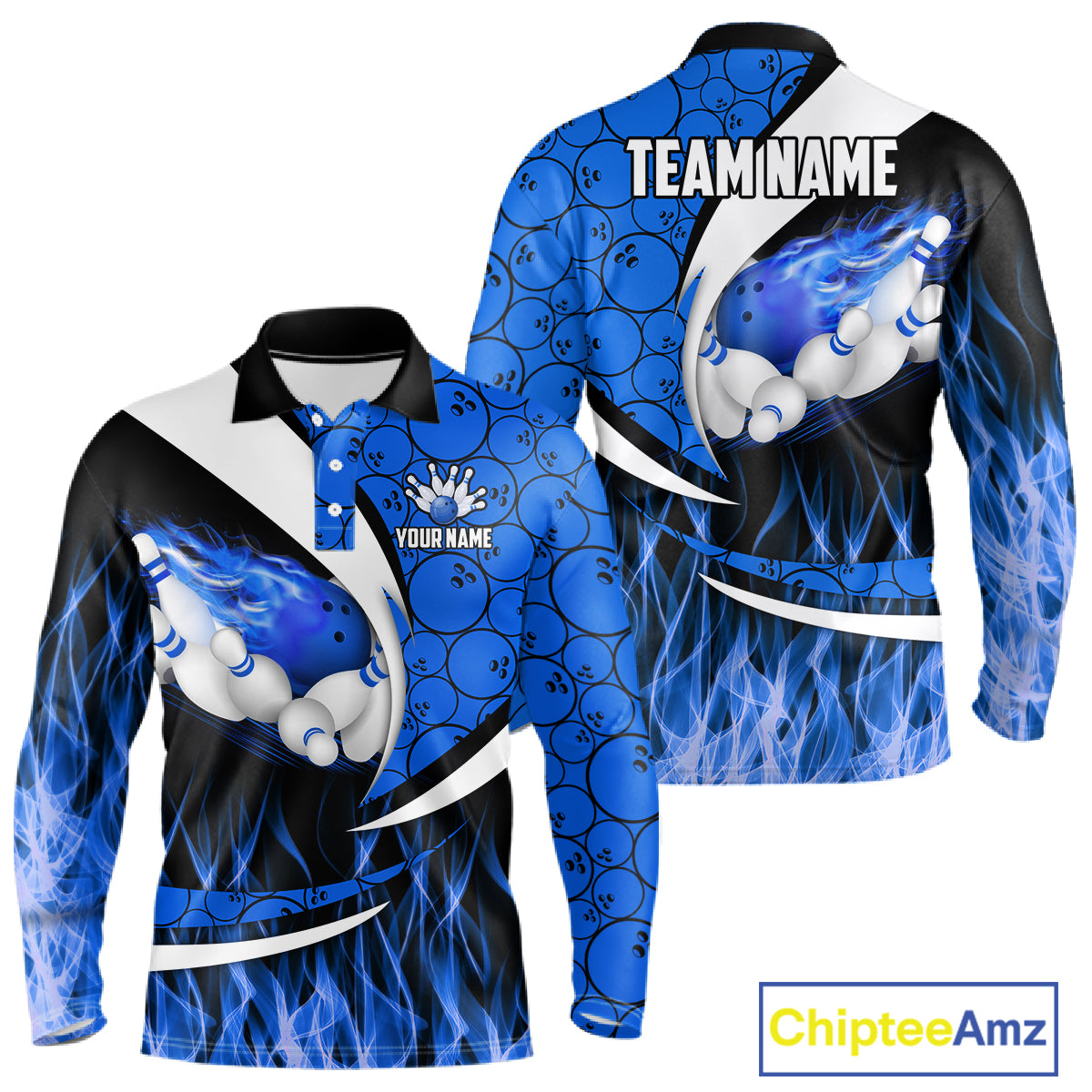 Blue Flame Bowling Camo Bowling Polo, Quarter Zip Shirts For Men Custom Bowling Team Bowler Jerseys NQS11195