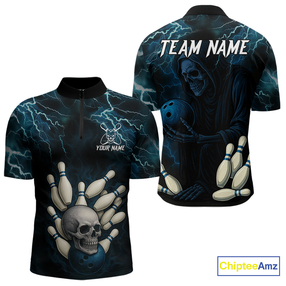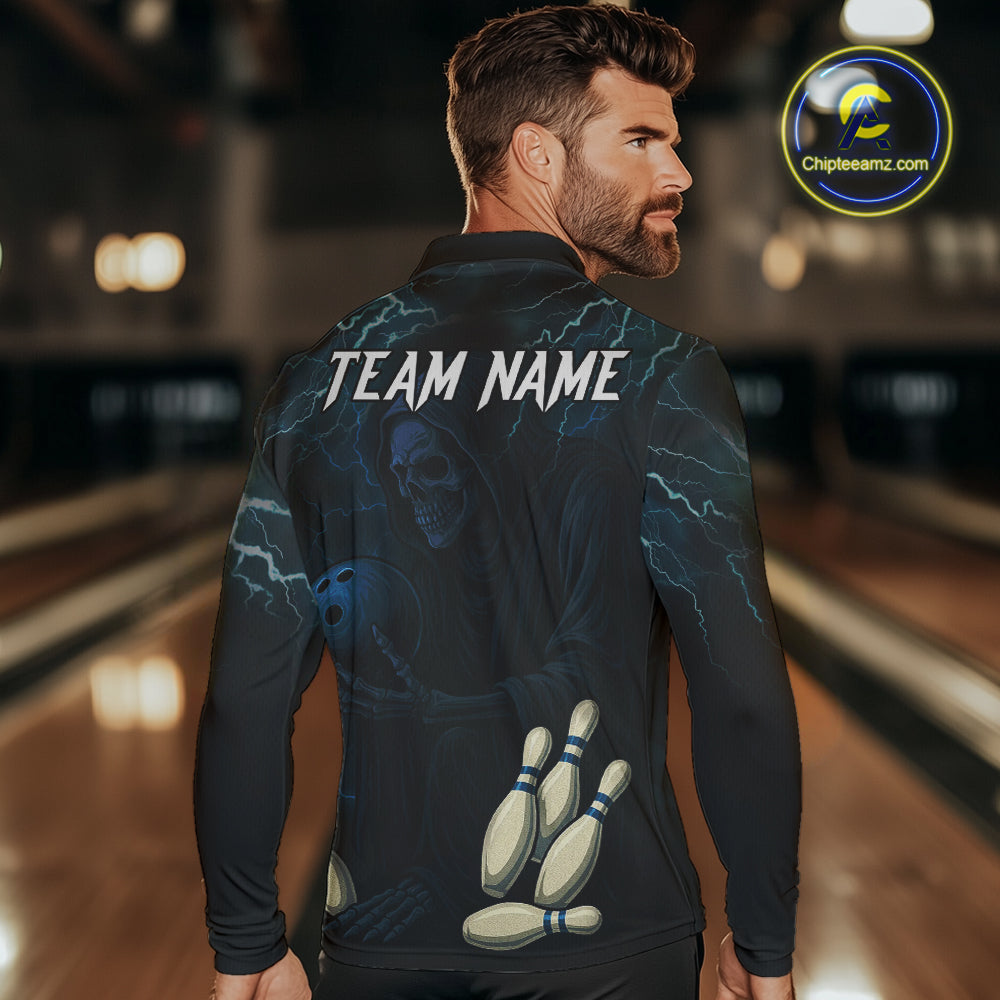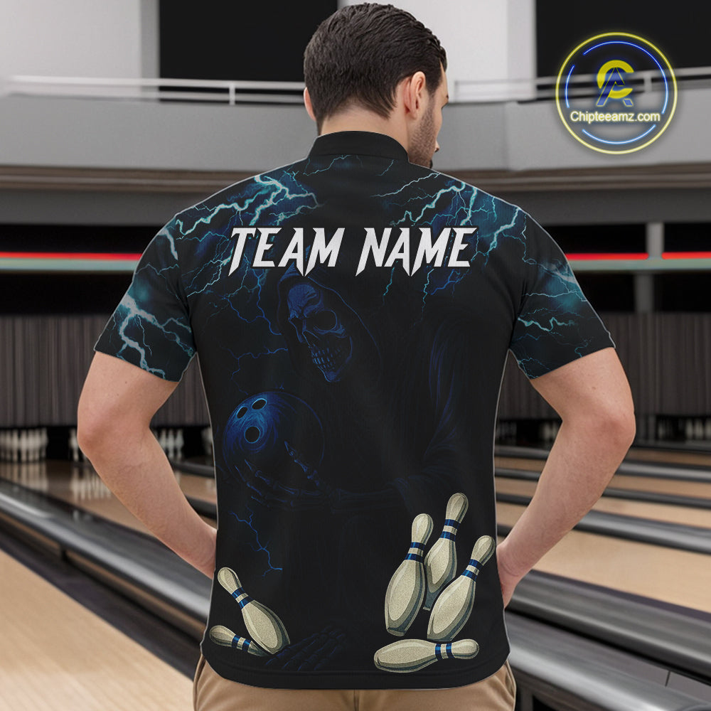Blue Thunder Lightning Skull Reaper Bowling Polo, 1/4 Zip Shirts For Men Custom team bowling jerseys NQS9849