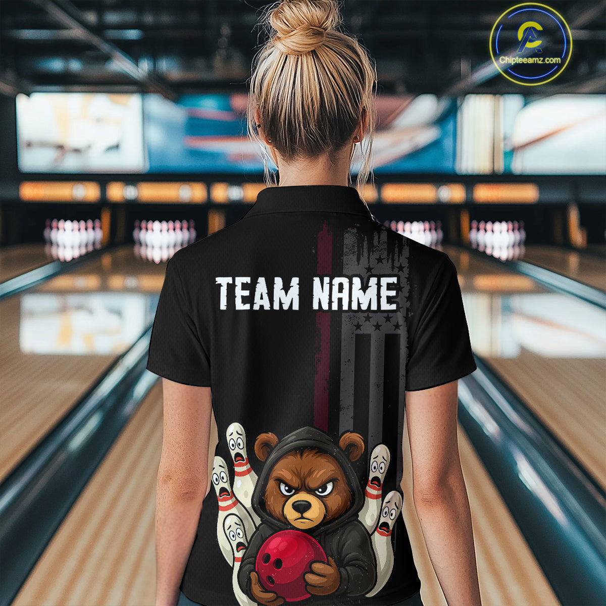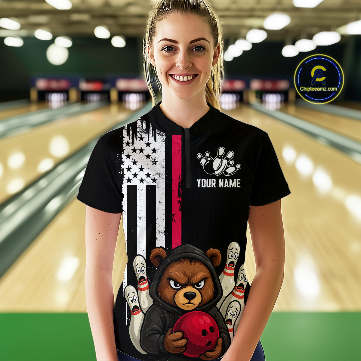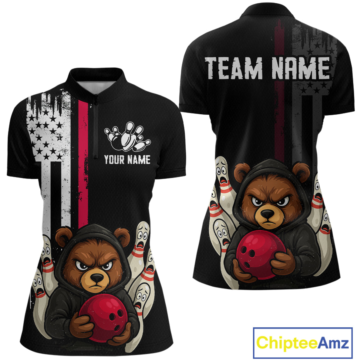 Custom American Flag Bear Bowling Women Polo & 1/4 Zip Shirts Bowling Team Jerseys HNT90