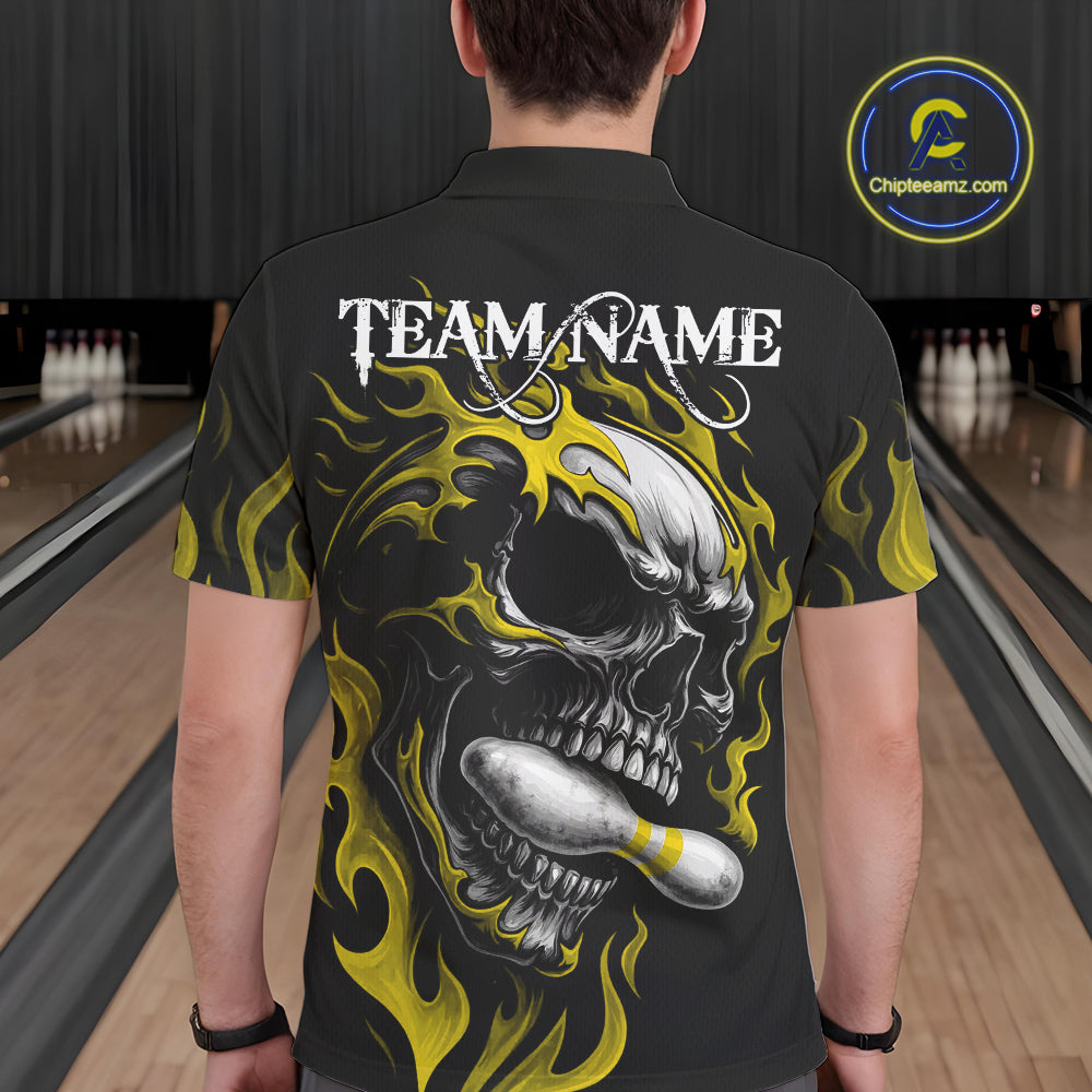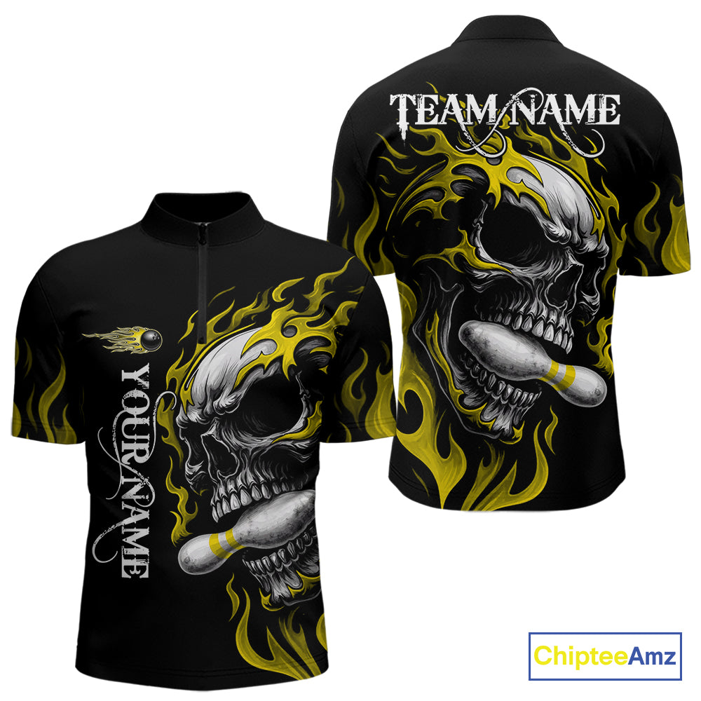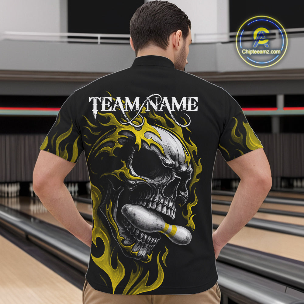 Custom Black and Gold Flame Skull Bowling Shirts For Men, Personalized Skull Team Bowling Jersey NQS10795