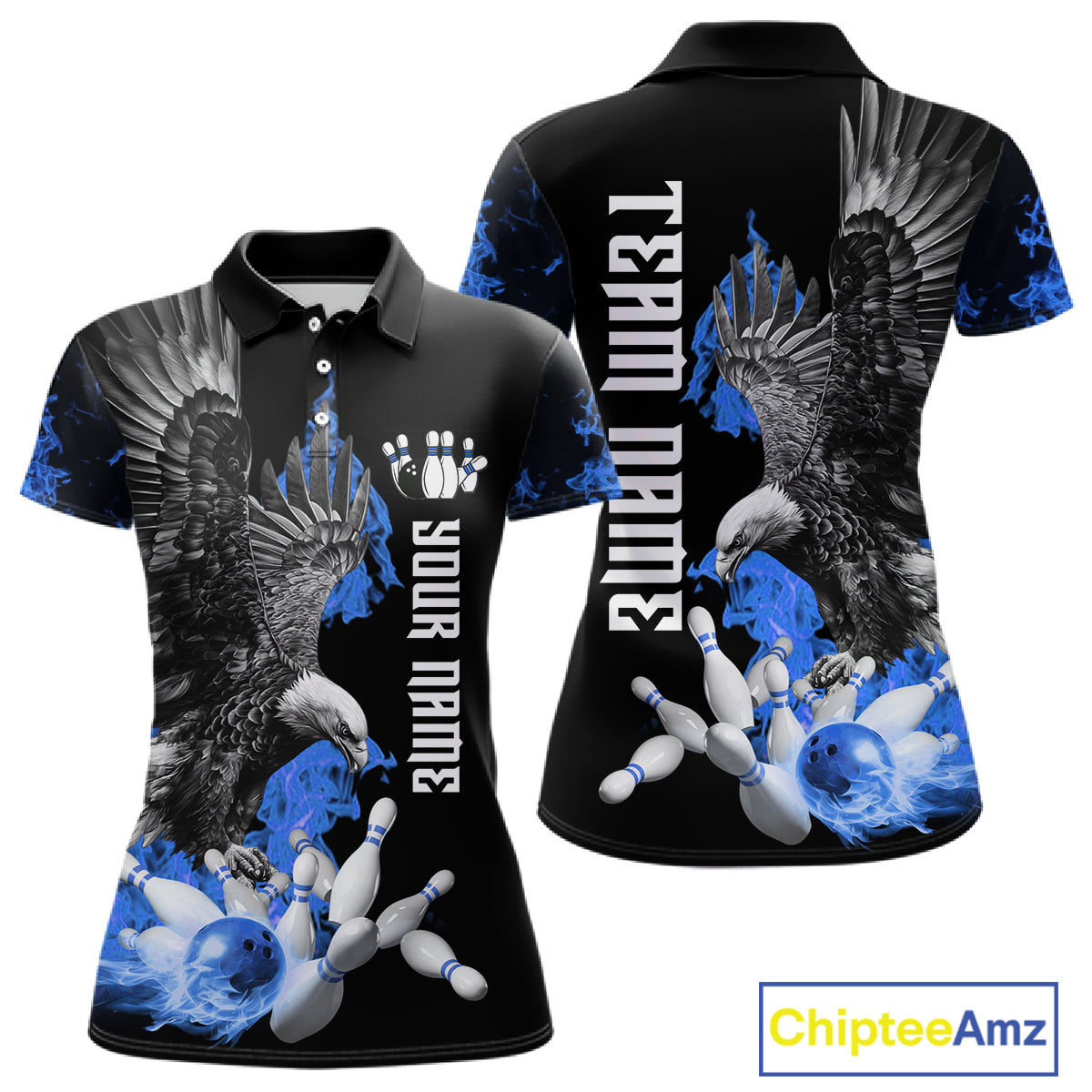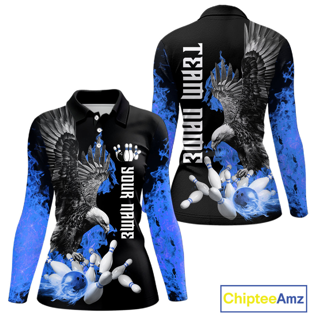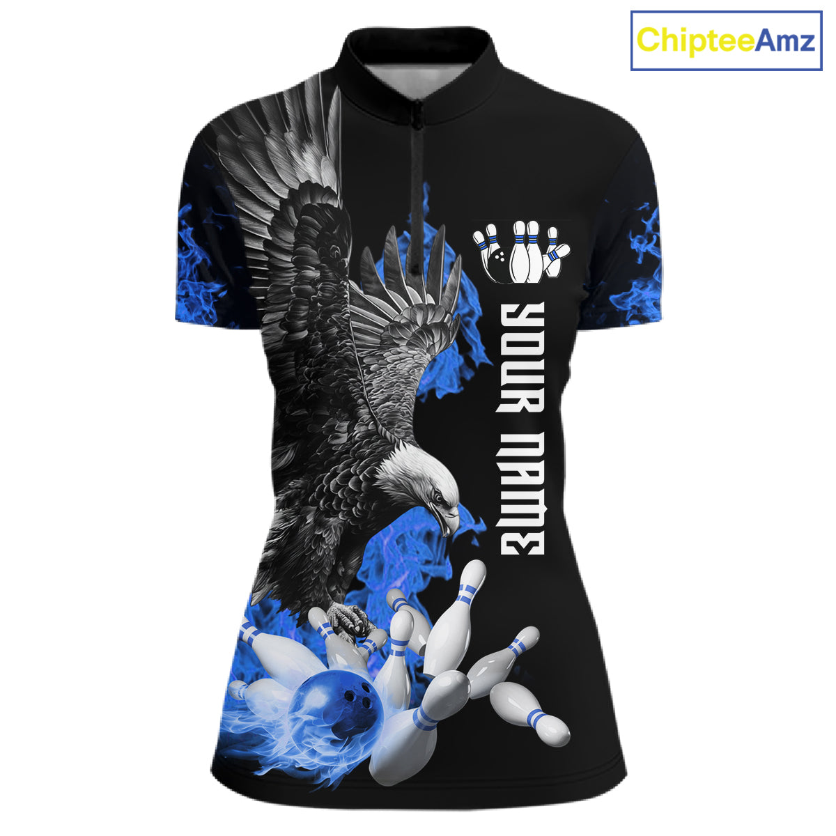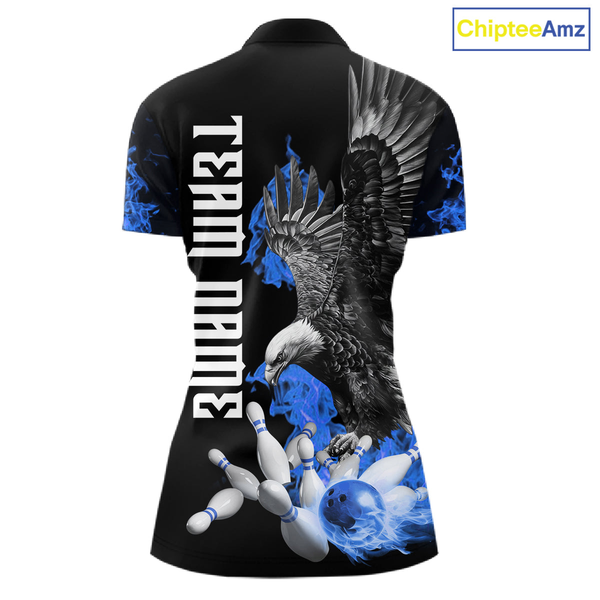 Custom Blue Flame Black Eagle Bowling Polo, Quarter Zip Shirt For Women, Team Bowling Clothes NQS11501