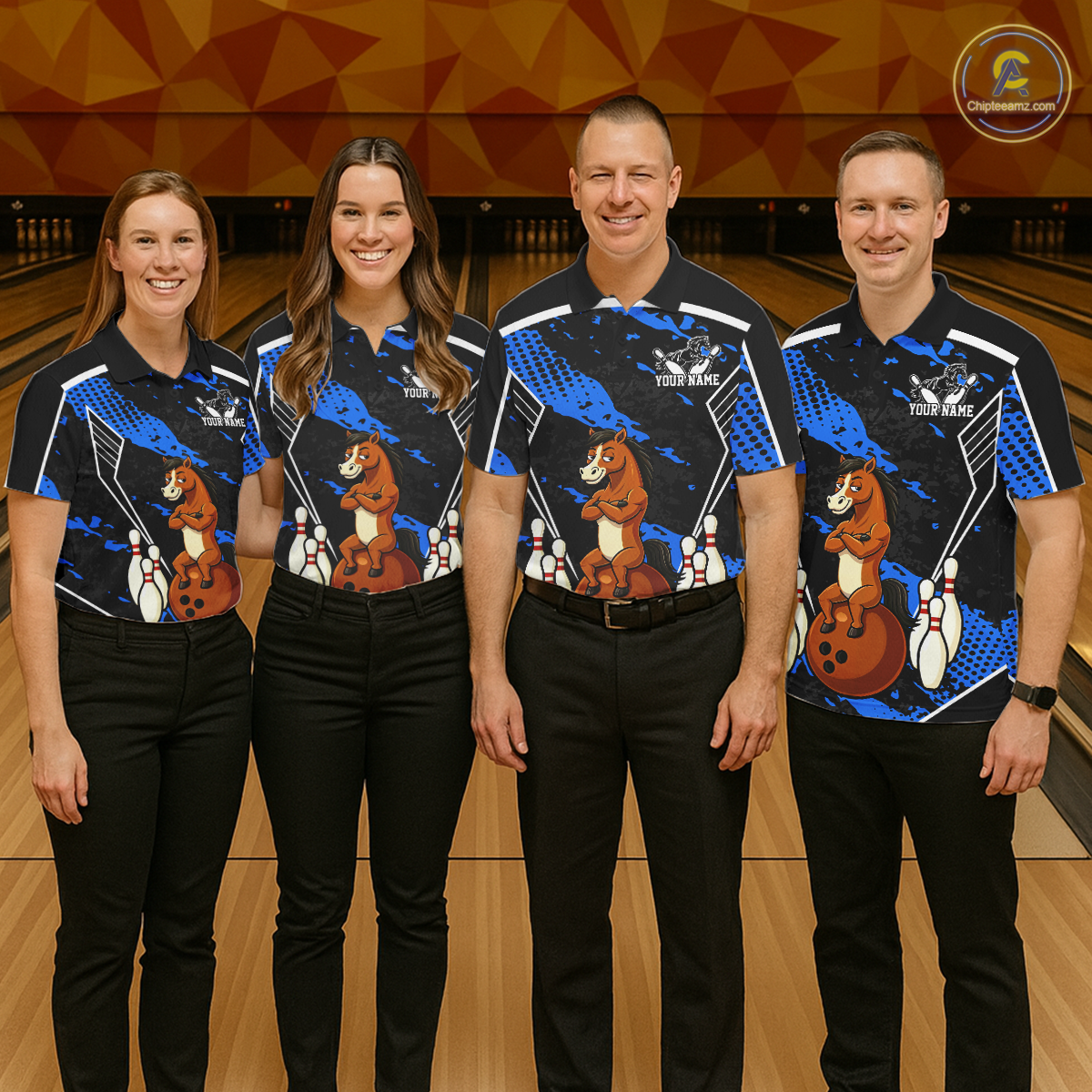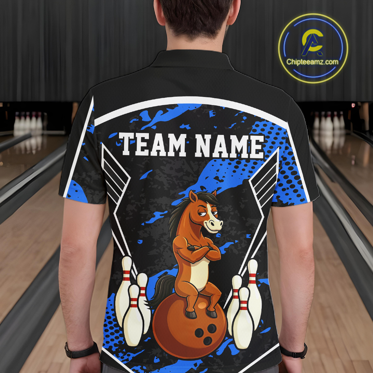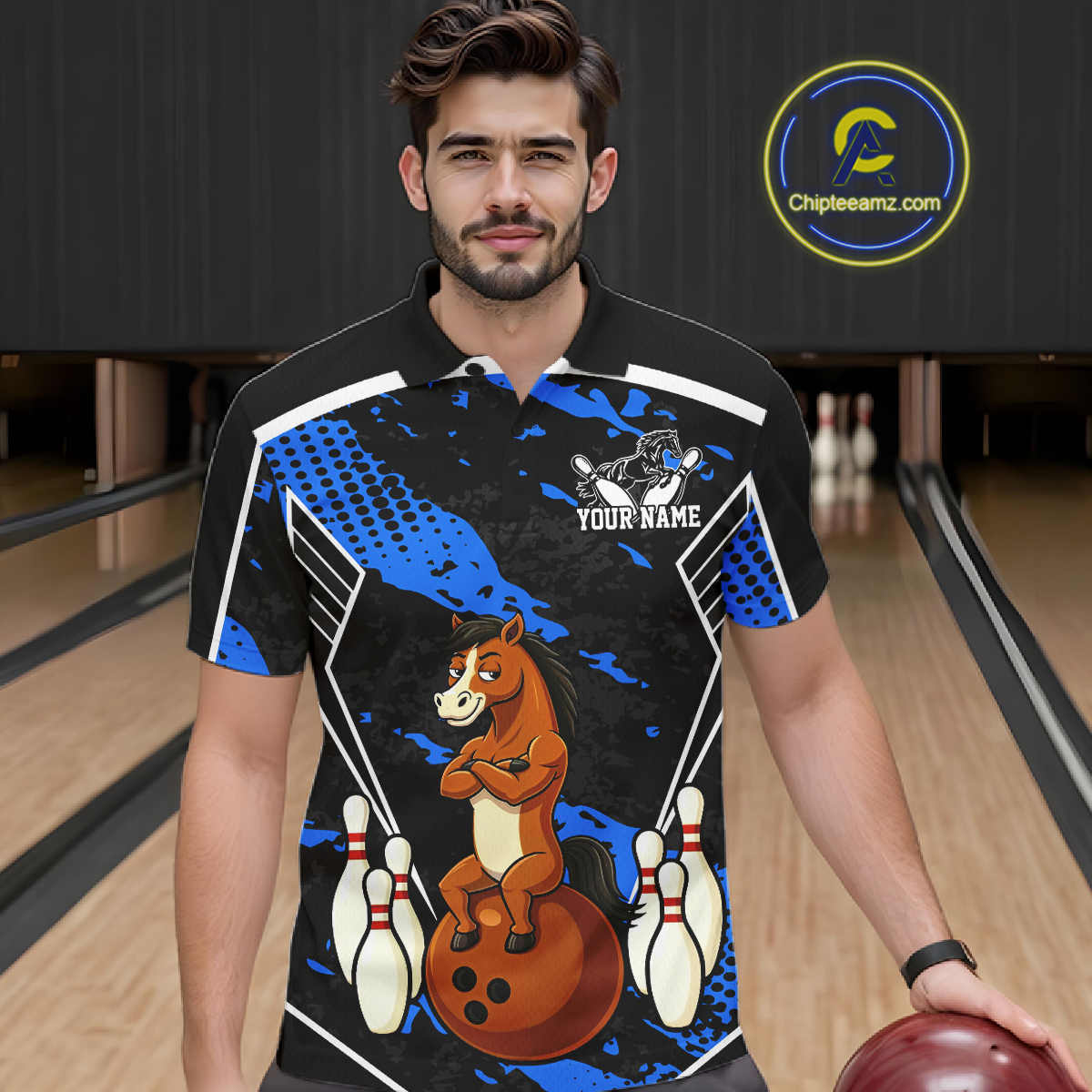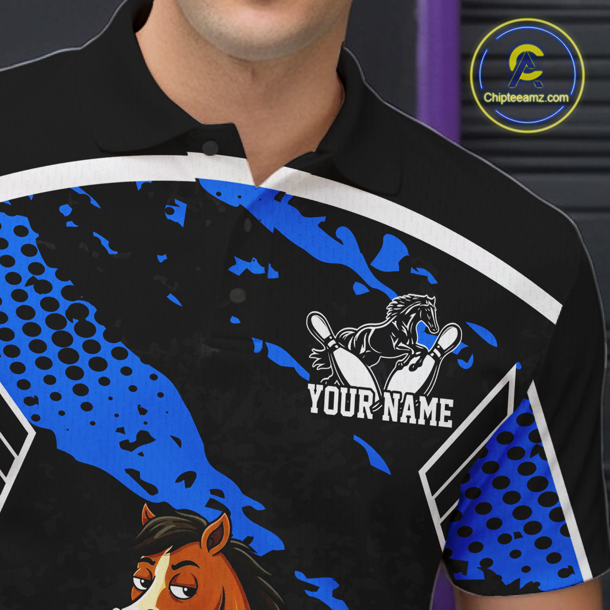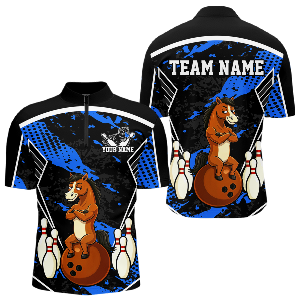 Custom Blue Funny Horse Bowling Tournament Jersey for Men Bowling Team Shirts Polo & 1/4 Zip HNT180