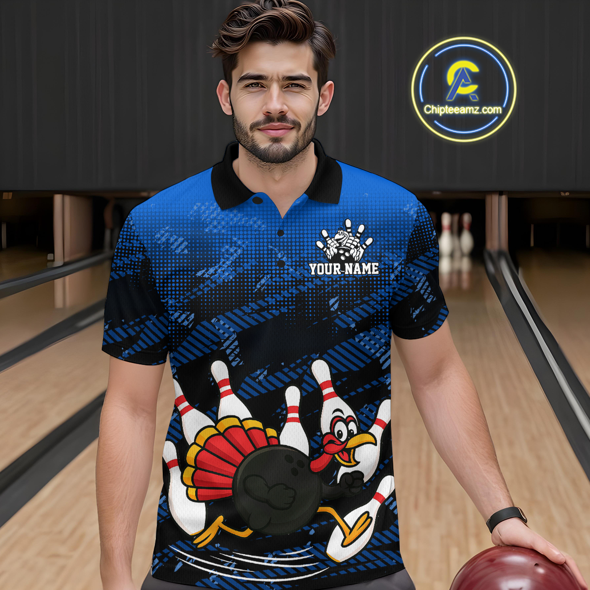 Custom Blue Funny Turkey Bowling Jersey for Men Thanksgiving Bowling Team Shirts Polo & 1/4 Zip HNT125
