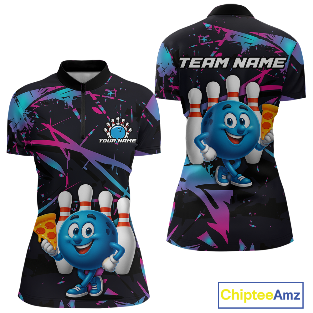 Custom Blue & Pink Funny Bowling with Food for Women Bowling Shirt Polo & 1/4 Zip QZT797