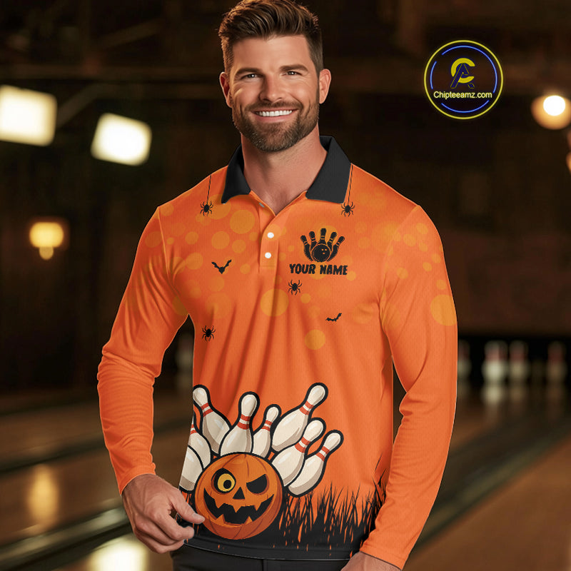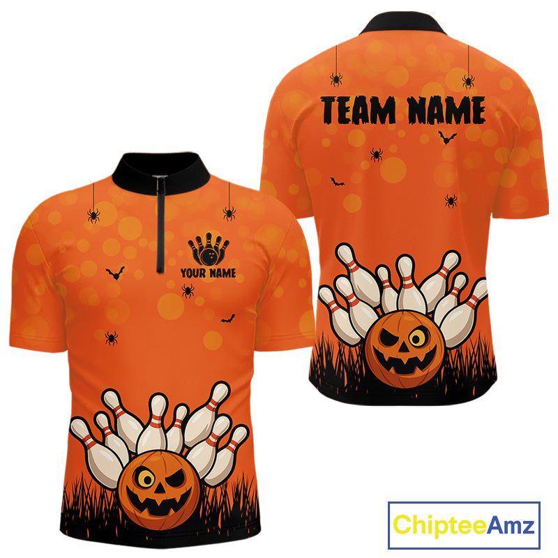 Custom Funny orange Bowling Team Shirt Halloween Polo & Quarter-Zip Bowling Jersey for Men NQS10396