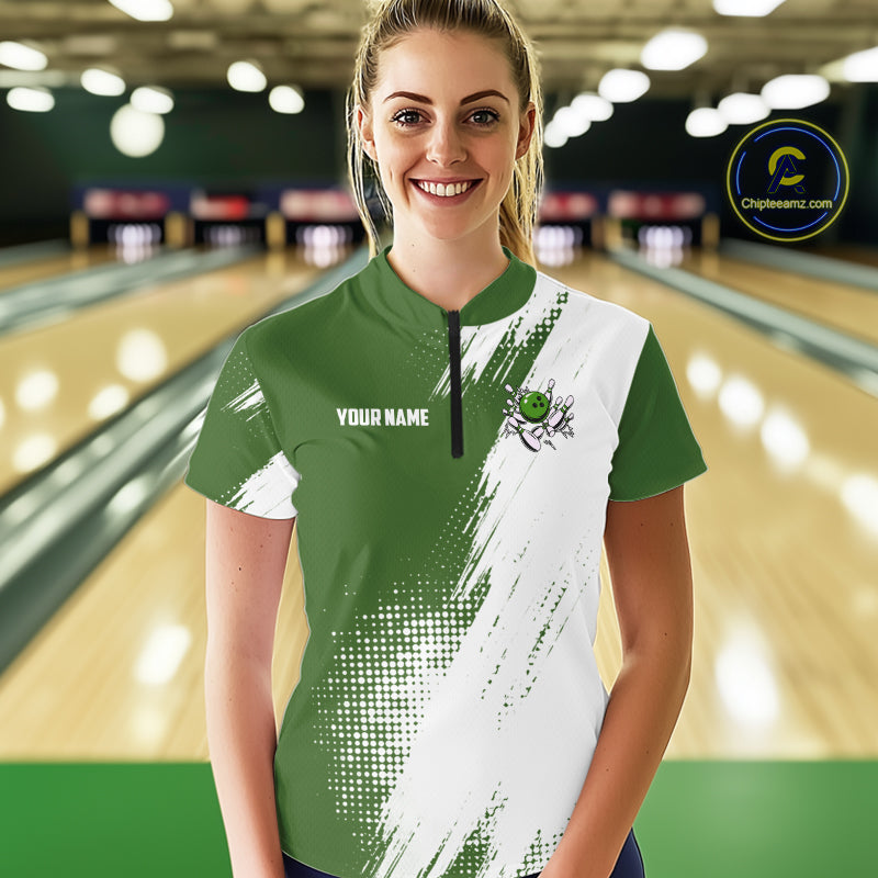 Custom Green and White Strike Bowling Shirts Women Polo, 1/4 Zip Bowling Team Jerseys Bowling League NQS11037